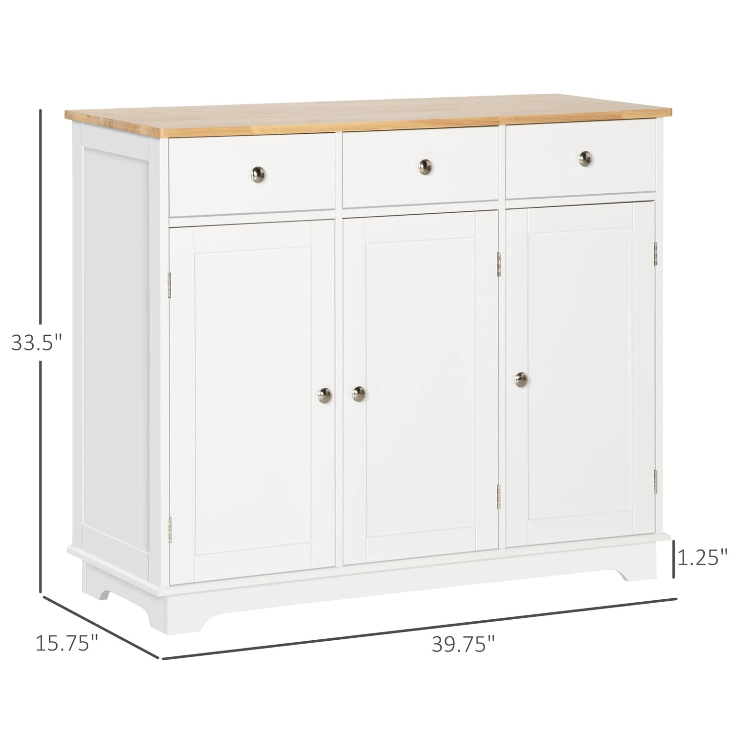 HOMCOM Sideboard with Solid Wood Countertop, Modern Kitchen Storage Cabinet, Coffee Bar Cabinet with 3 Drawers, Doors and Adjustable Shelf, White