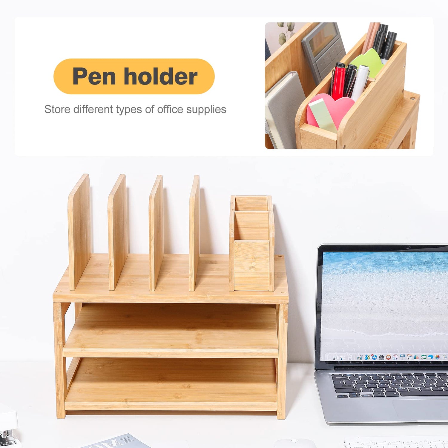 Homde Bamboo Desk Organizer with File Holder, Office Organization for Desks with Adjustable Pen Holding, Desktop Letter Paper Tray Storage for Workplace Home School (3-Tier,Natural)