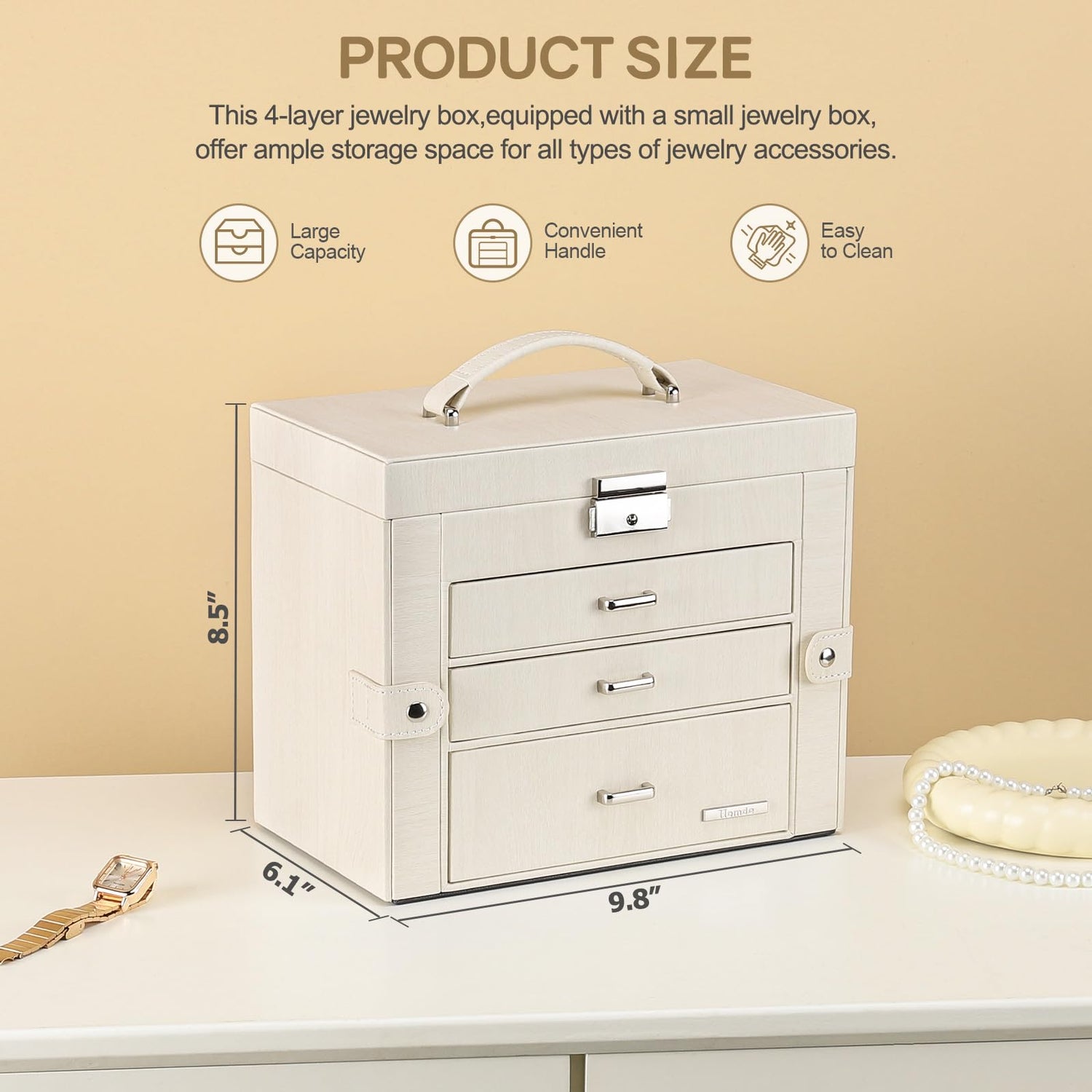 - PRACTICAL STRUCTURE: 4 layers with 3 pull-out drawers, 2 side doors with 16 necklace hooks, 1 ring roll, 4 earring cards, 9 different size compartments, 2 watch pillows and a mini jewelry case, suits for necklaces, earrings, rings, bracelets, hairpins, cufflinks, brooches and other jewelry.