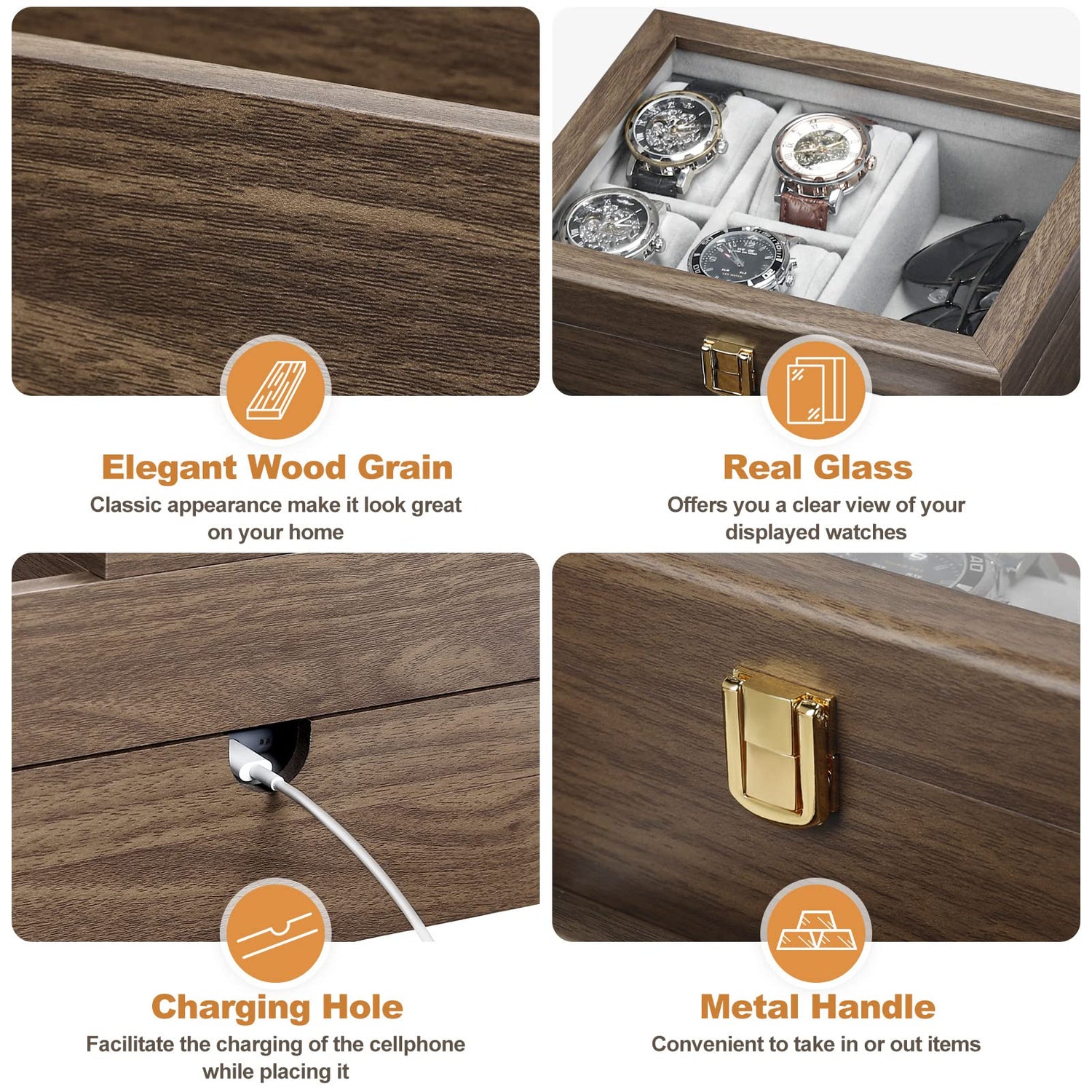 - Thoughtful Details: Real glass lid protects your items from scratches or dust, and offers you a clear view of your displayed accessories. In addition, the middle drawer is equipped with a hole, which can also facilitate the charging of the cellphone while placing it