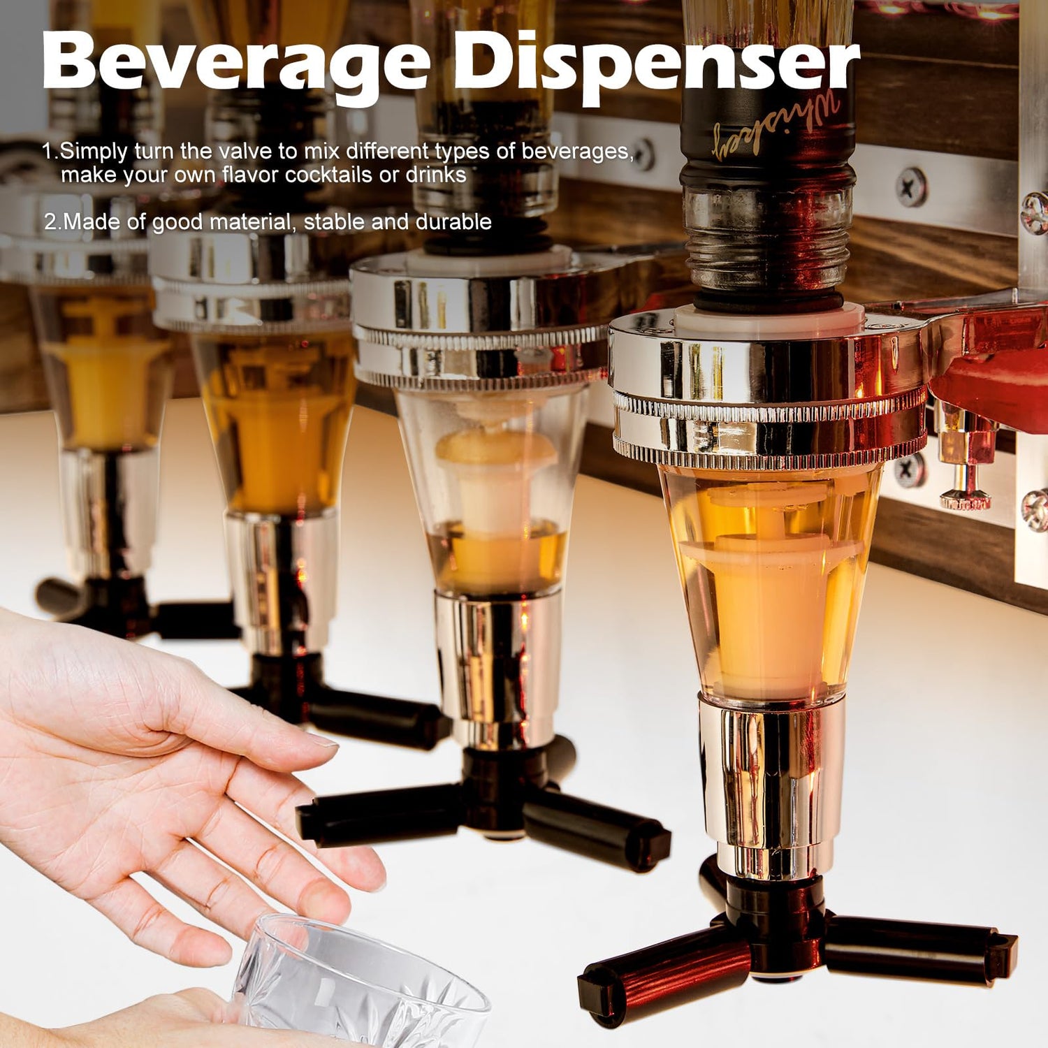- BEVERAGE DISPENSER: The left side of the wall-mounted wine rack is equipped with four wine dispensers, suitable for standard bottles of 0.7-1 liters of gin, whiskey, wine, rum, liqueur, etc. With this home mini-bar you can also easily prepare drinks, cocktails and shooters. Maximum load-bearing capacity on the left side of the dispensing area: 22lbs