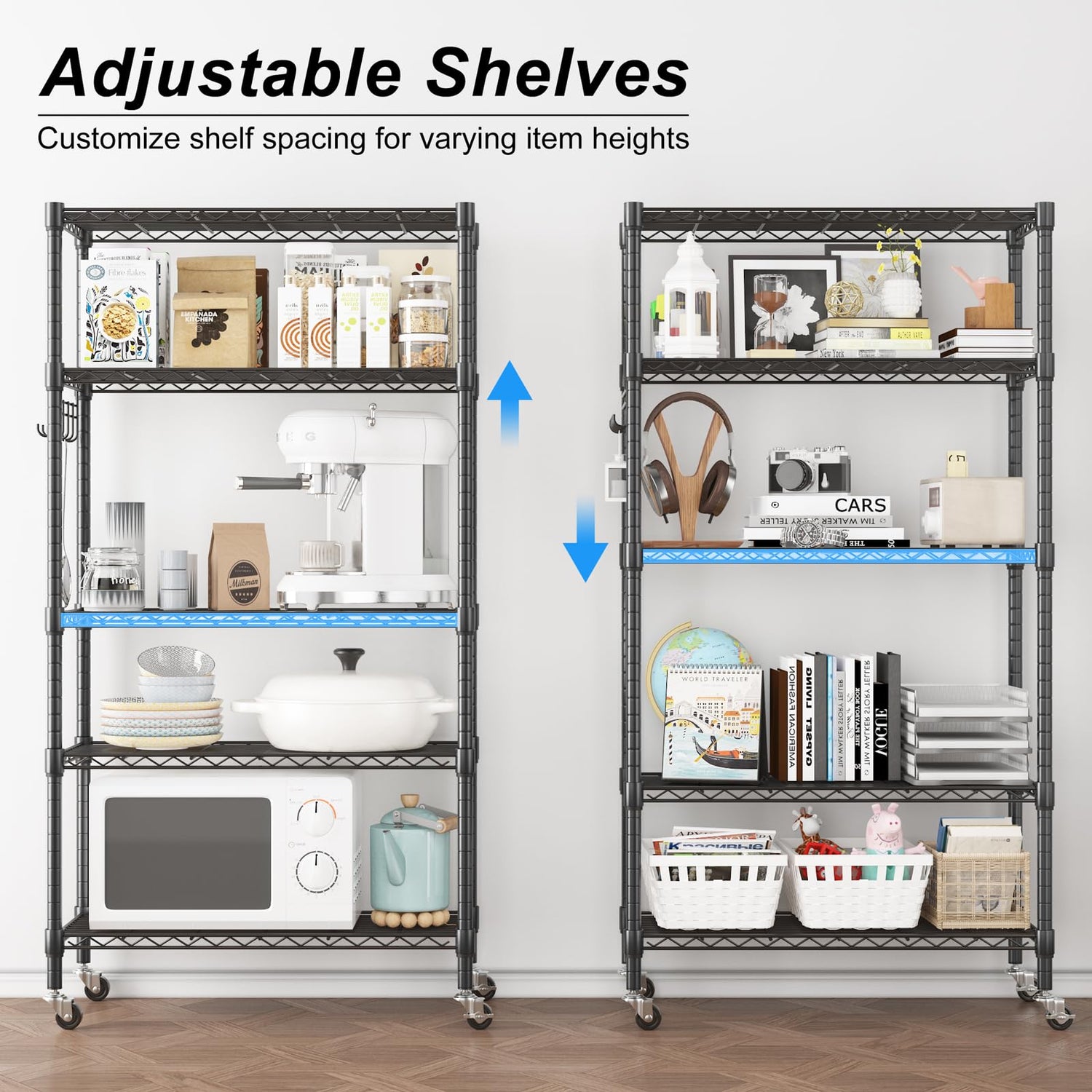 Homdox 5 Tier Metal Storage Shelves with Wheels, Heavy Duty Wire Shelving Unit, Adjustable Storage Racks with Side Hooks for Bathroom Kitchen Garage
