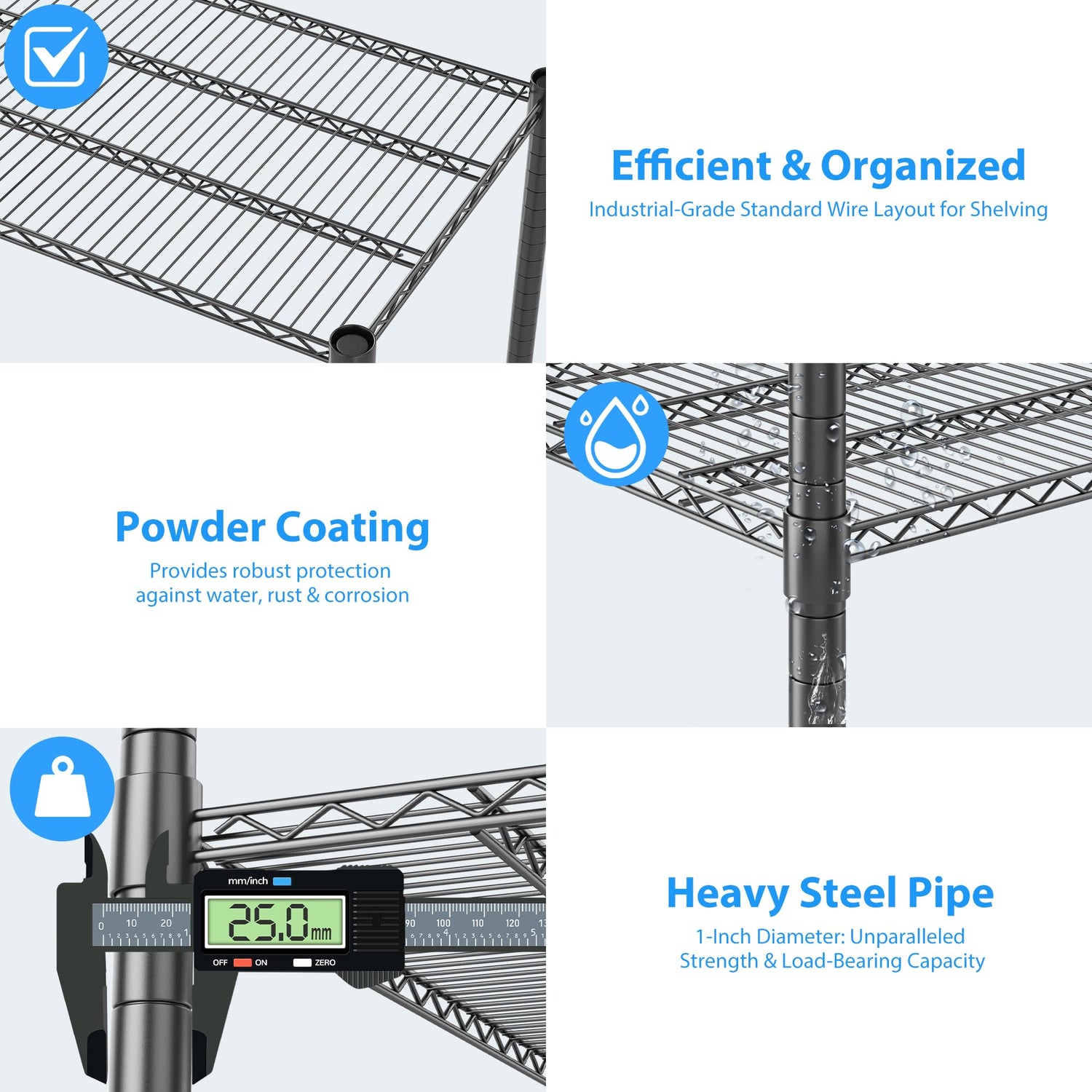 - 【COMMERCIAL GRADE LOAD CAPACITY】The heavy duty shelving unit holds up to 2500 lbs on leveling feet (800 lbs on wheels), featuring sturdy carbon steel construction with 1-inch pipes and reinforced dual-layer design. Its powder-coated finish ensures rust resistance, making it suitable for industrial-grade use