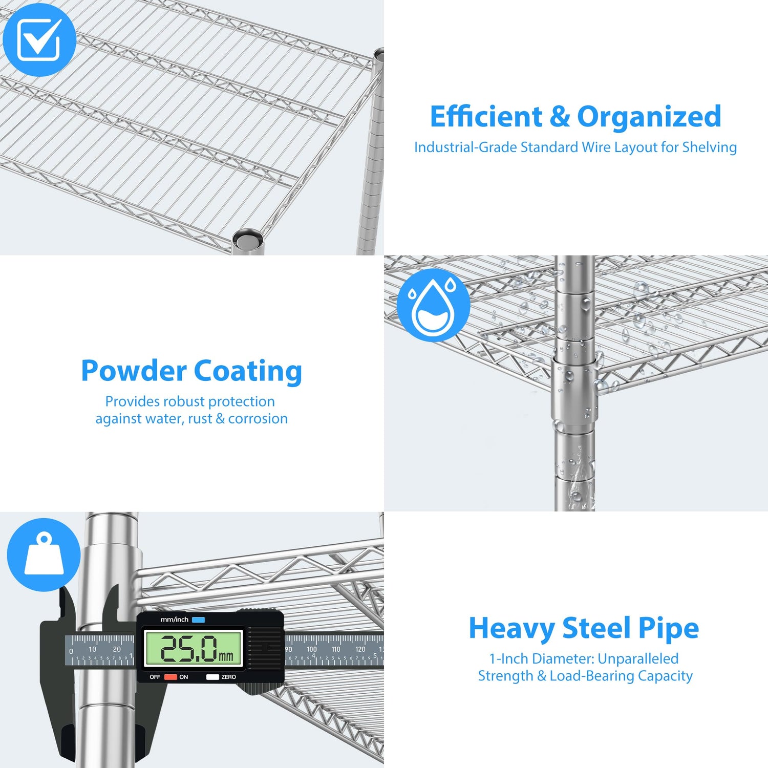 - 【HIGH LOAD CAPACITY】Made of high-quality carbon steel and 1-inch pipes, each shelf supports up to 750 lbs, with a total unit capacity of 3000 lbs on leveling feet, 800lbs on wheels