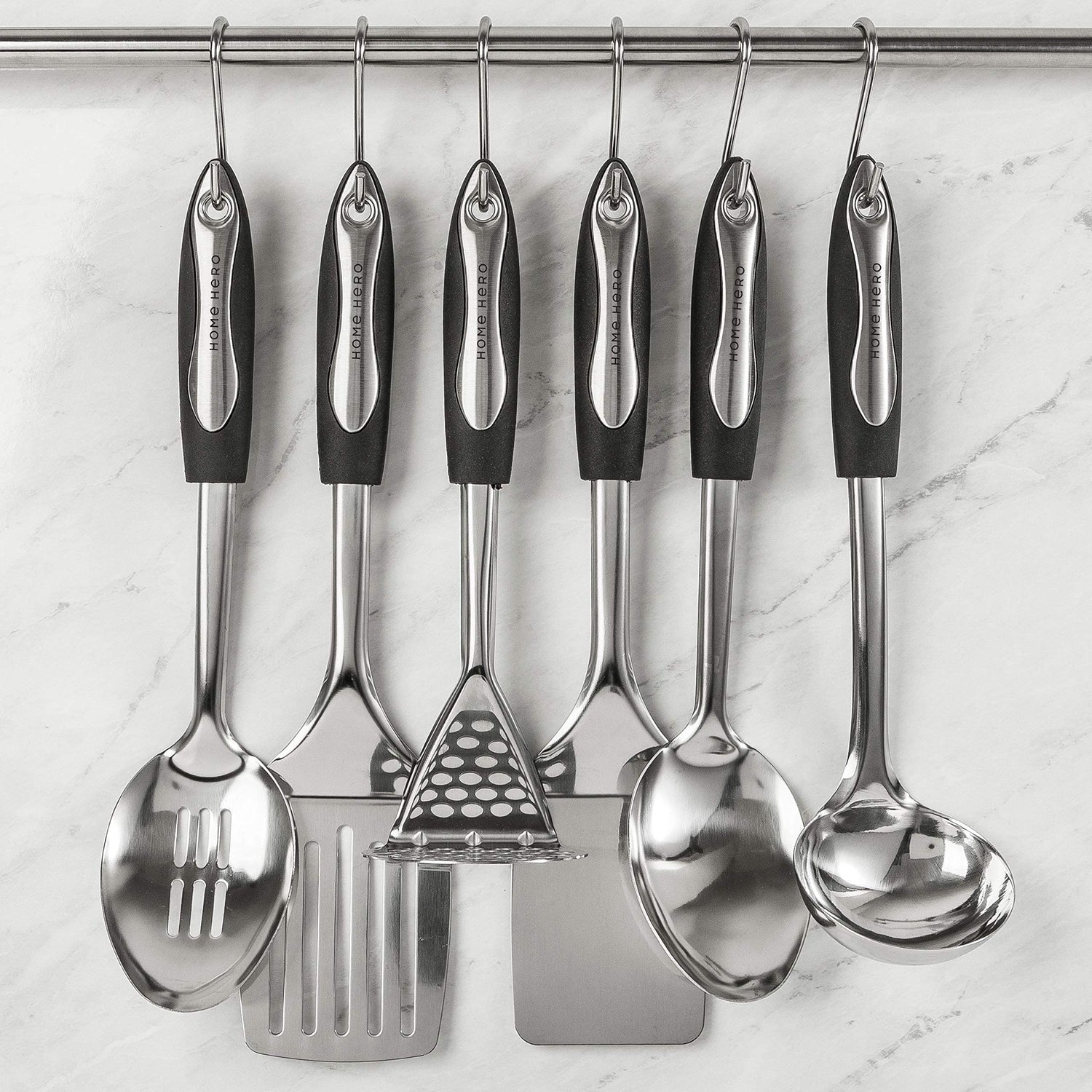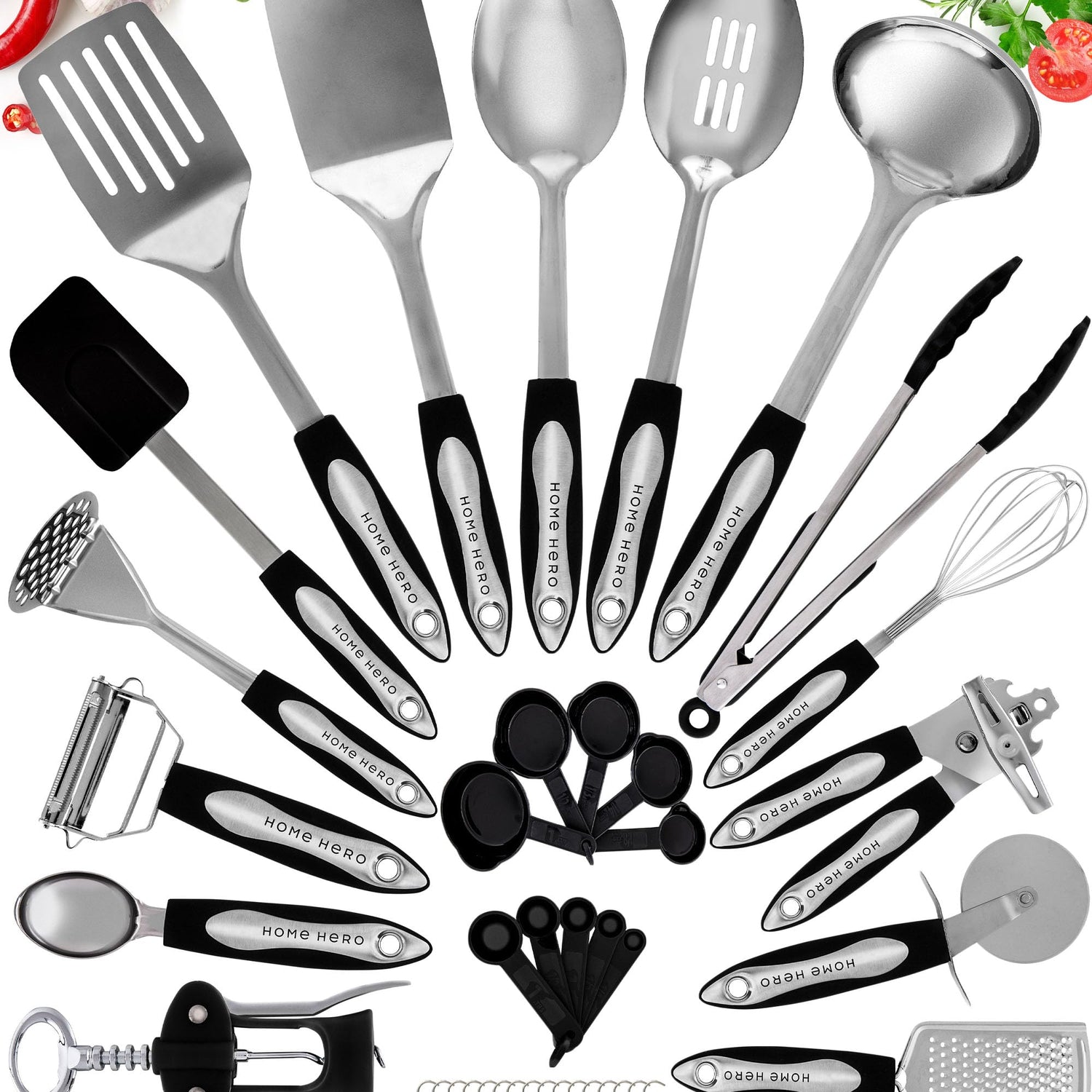 - Suited to any kitchen, HomeHero is the best kitchen utensils set you could ask for. Crafted with 100% stainless steel & silicone non - stick materials, these timeless stainless steel utensil set are beautiful housewarming gifts. With measuring cups & measuring spoons, skimmer, slotted spatula, garlic press, cheese knife, tea strainer, wine opener, potato peeler & more, you have everything you need to cook masterful meals. Scroll to see complete list of cooking tools.