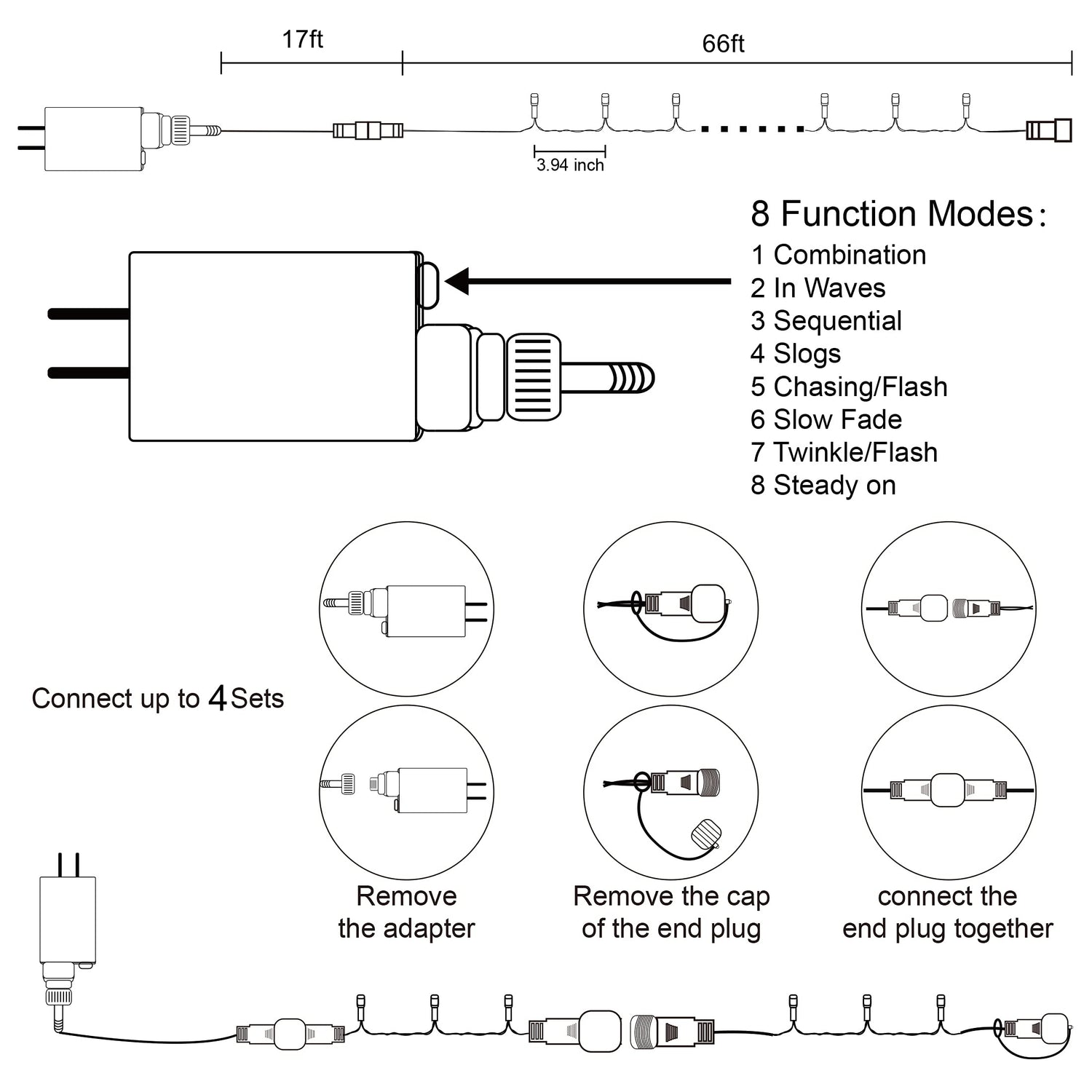 - 66ft Christmas string lights with 200 warm white individual LED bulbs. Each Christmas lights has end-to-end connection, you can connect up to 4 sets together to illuminate a wider range.