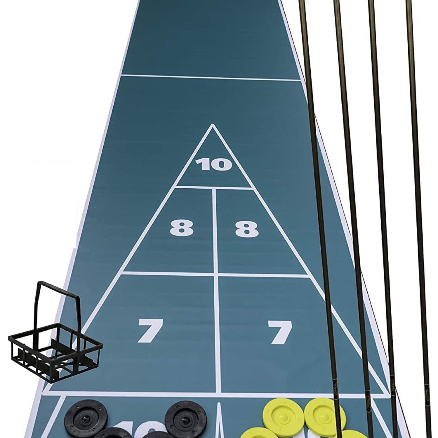 Details: Home Shuffleboard Court Package: Play shuffleboard at home! Made of a thin vinyl to ensure that the court takes on the hardness of the surface underneath it, this rollout shuffleboard court is suitable for indoor or outdoor play. It requires a smooth, level, clean surface that is free of debris (such as rocks, sticks, or other sharp objects). Uneven or bumpy surfaces may damage the court. Remember: shuffleboard discs slide fastest on hard surfaces! Set Includes: - Roll Out Shuffleboard Court (28'L X 54" W) - 4 - 66" Tournament Grade Shuffleboard Cues with Continental Swivel Heads - 8 - Official Tournament Shuffleboard Discs 6" (4 Yellow, 4 Black) - Shuffleboard Disc Carrier - Shuffleboard Rules Sheet