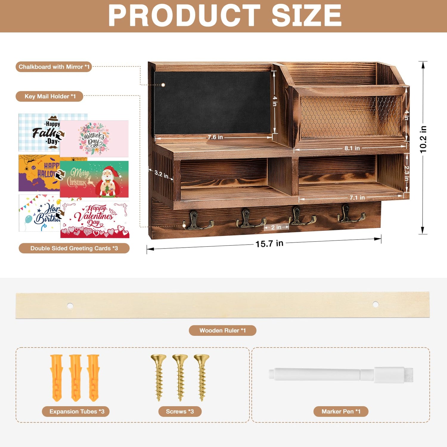 - Practical and Versatile: Wooden key rack contains 8 key hooks, 1 mail organizer, 2 storage boxes, 1 storage shelf, can easily store keys, mails, wallets, glasses, put on small plants, knick-knacks, insert blackboard, mirror, greeting cards, photos in slot to decorate it, perfect for your constant organizing needs, save much space and looks nice when hanging on the wall.