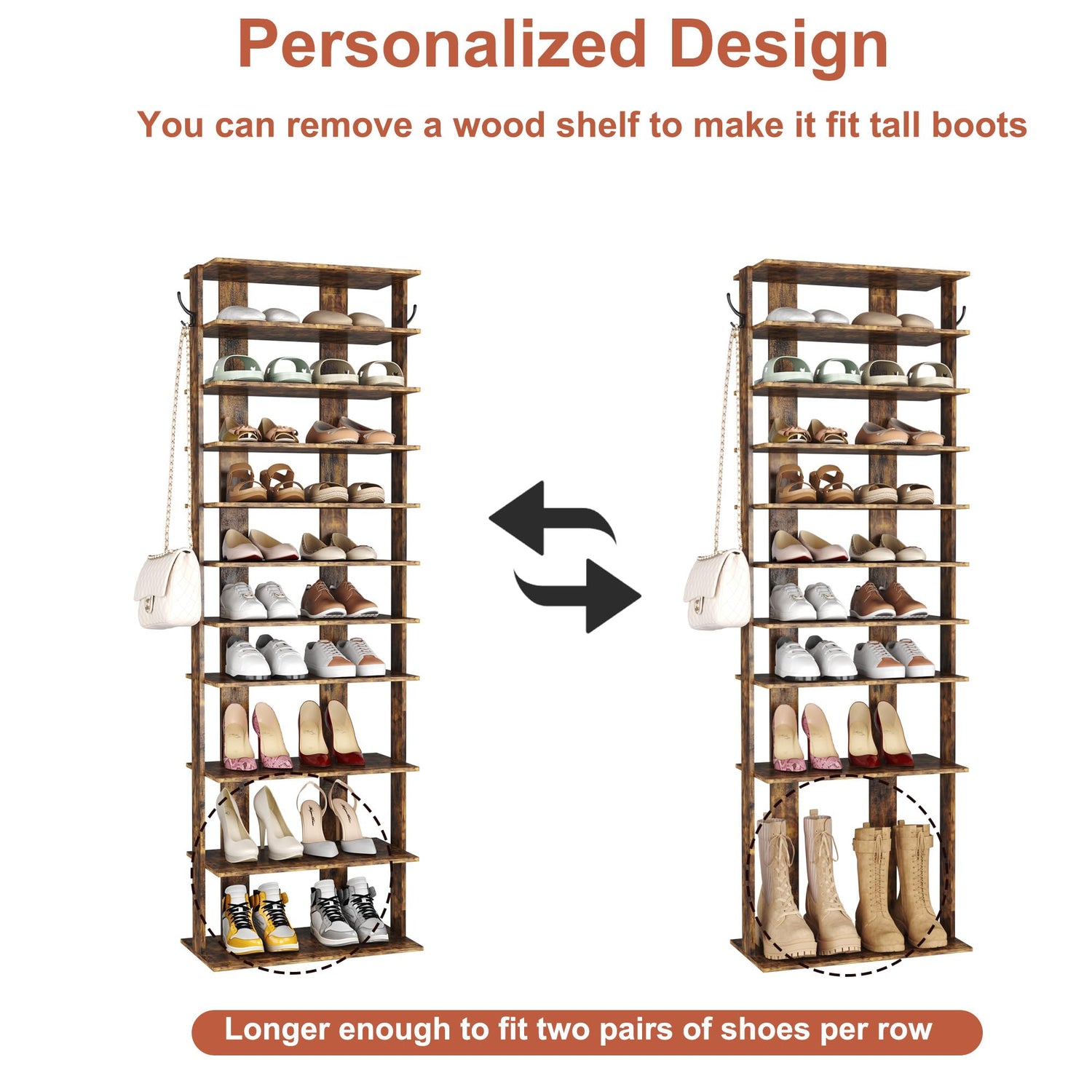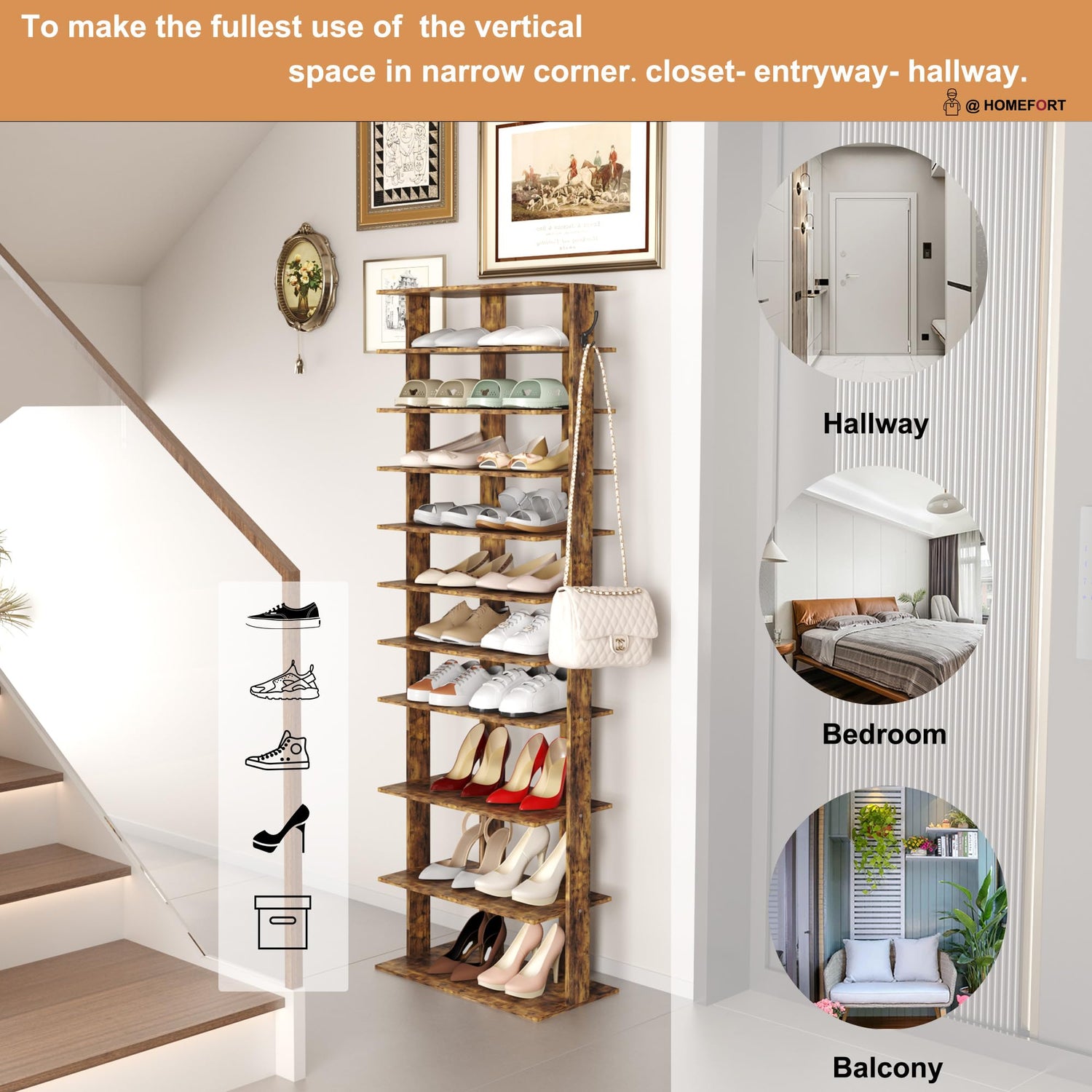 HOMEFORT 10-Tier Vertical Shoe Rack, Corner Shoe Tower, Double Rows 10 Tiers Shoe Shelf, Slim Shoe Storage Unit for 20 Pairs of Shoes, Shoe Stand for Entryway, Hallway, Closet (Rustic Brown)