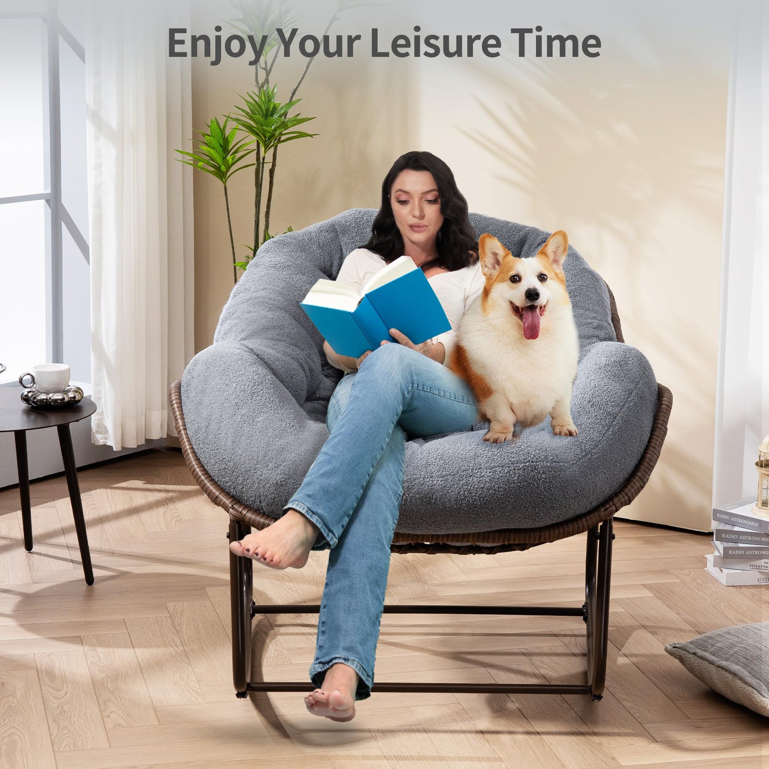 HOMEFUN Outdoor Patio Rocking Chairs, Oversized Papasan Rock Chair Indoor with Teddy Padded Cushion - Rocker Egg for Front Porch, Garden, Backyard Dark Gray