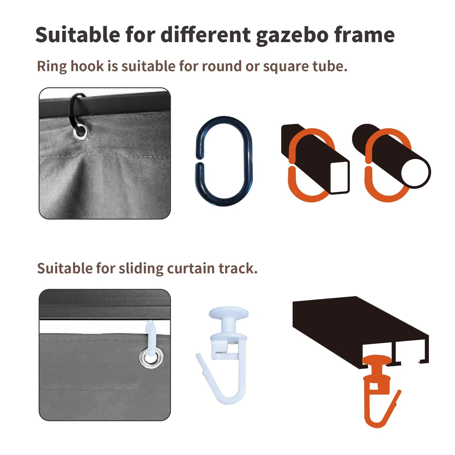 - 【Outdoor Replacement Gazebo Curtains Waterproof】Size: 10*10*6.9ft & 10*12*6.9ft. 4-Panels Gazebo Curtains, and two kinds of hooks are also given, which can fit different types of gazebos. Please check the size of your gazebo before purchasing to make sure our gazebo curtains fit it. If you have any problems during installation or use, please contact us.
