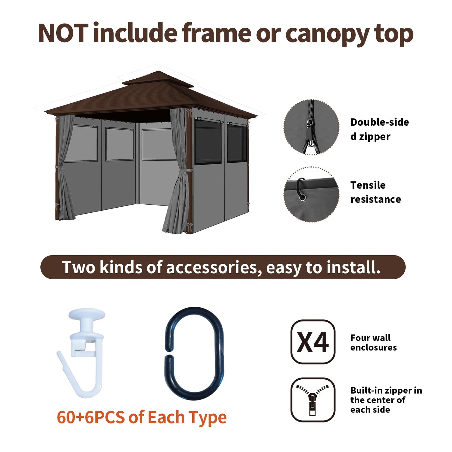 - 【Outdoor Replacement Gazebo Curtains Waterproof】Size: 10*10*6.9ft & 12*12*6.9ft. 4-Panels gazebo curtains outdoor waterproof with a mesh window for ventilation, and two kinds of hooks are also given, which can fit different types of gazebos. Please check the size of your gazebo before purchasing to make sure our gazebo curtains fit it. If you have any problems during installation or use, please contact us.