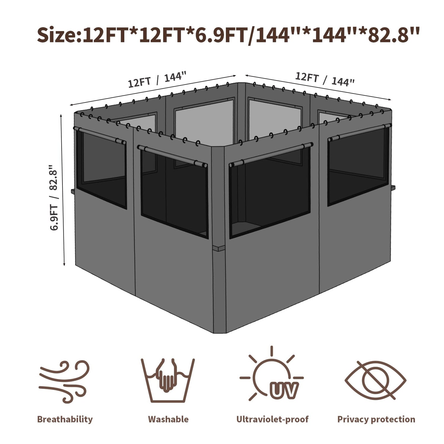 - 【New Upgrade & Four Side Hidden Mesh Window Design】We have two hidden mesh windows on each side of the privacy gazebo curtain. When you need to breathe, you can lift the removable, waterproof curtains held in place by Velcro and secure them with the buckle above the windows. When you feel cold and need to keep warm, then partially lower the curtain to block the breathable mesh windows. One curtain for many uses! Can be used in any season!
