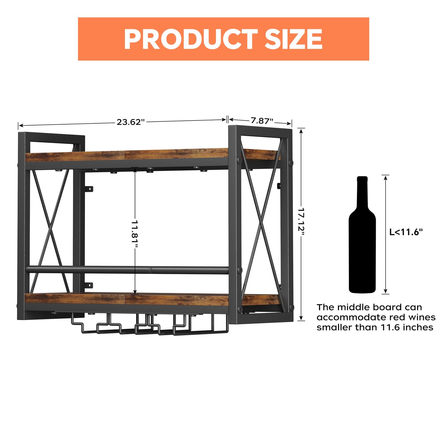- [2-IN-1 Wine Display Rack]: The wall-mounted wine bottle display rack combines wine bottle storage, shelving storage, and wine glass holder in one, shows a unique artistic atmosphere to add vintage look style to your living room entry room ect. (Product Size: 23.62’W×7.91’D×16.85’H)