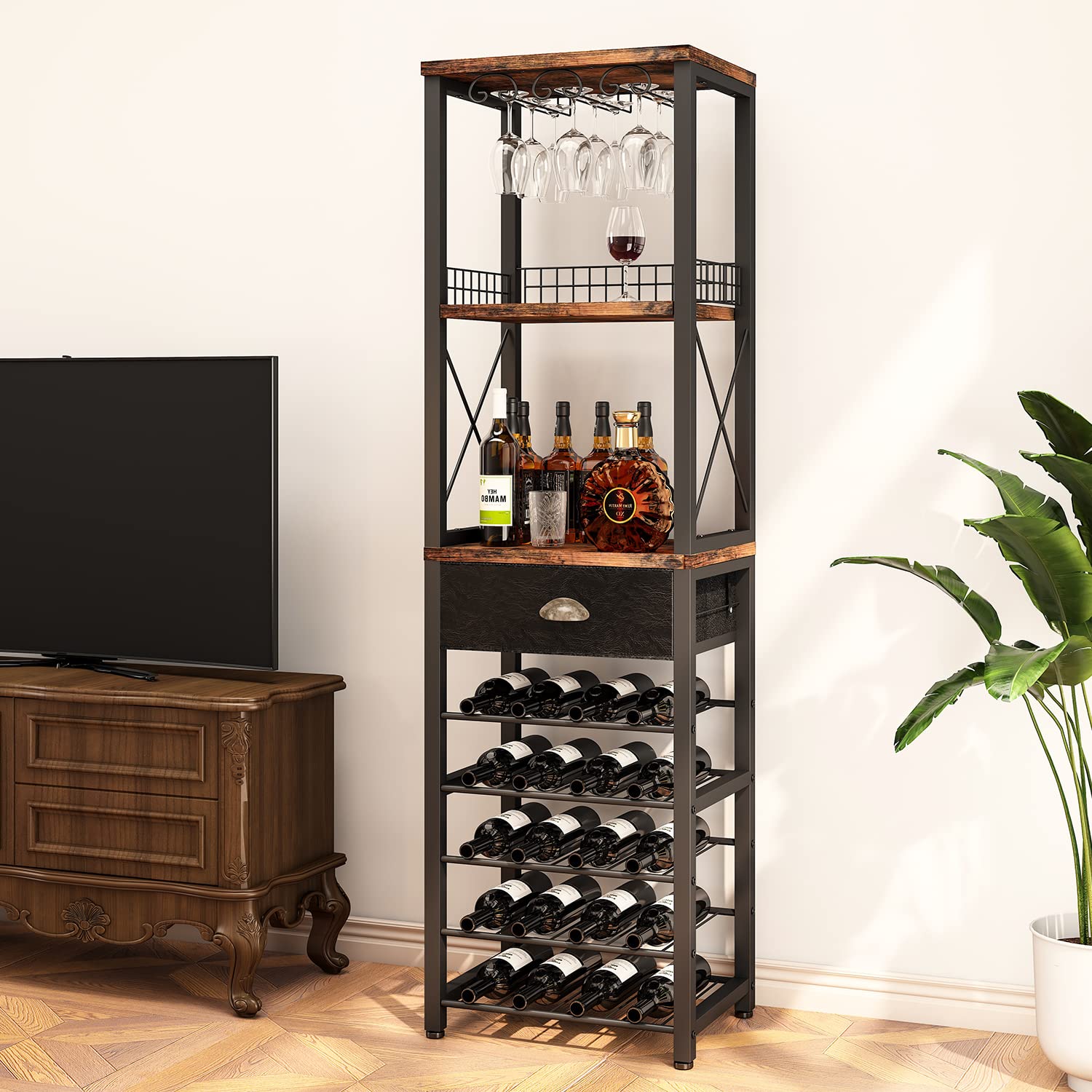 - 【Large Capacity】Featuring an open storage compartment,this wine rack allows you to store 9 glasses and 20 bottles of wine.Meanwhile, this wine glass rack provide more space to store your shorter Wine bottles such as XO,Remy Martin as well as Beer glasses on first and second tier.The Square and X-shaped iron frame have the function of beauty and preventing items from falling. Our wine glass holder fits perfectly in corner or against wall,can maximize the use of your limited space.
