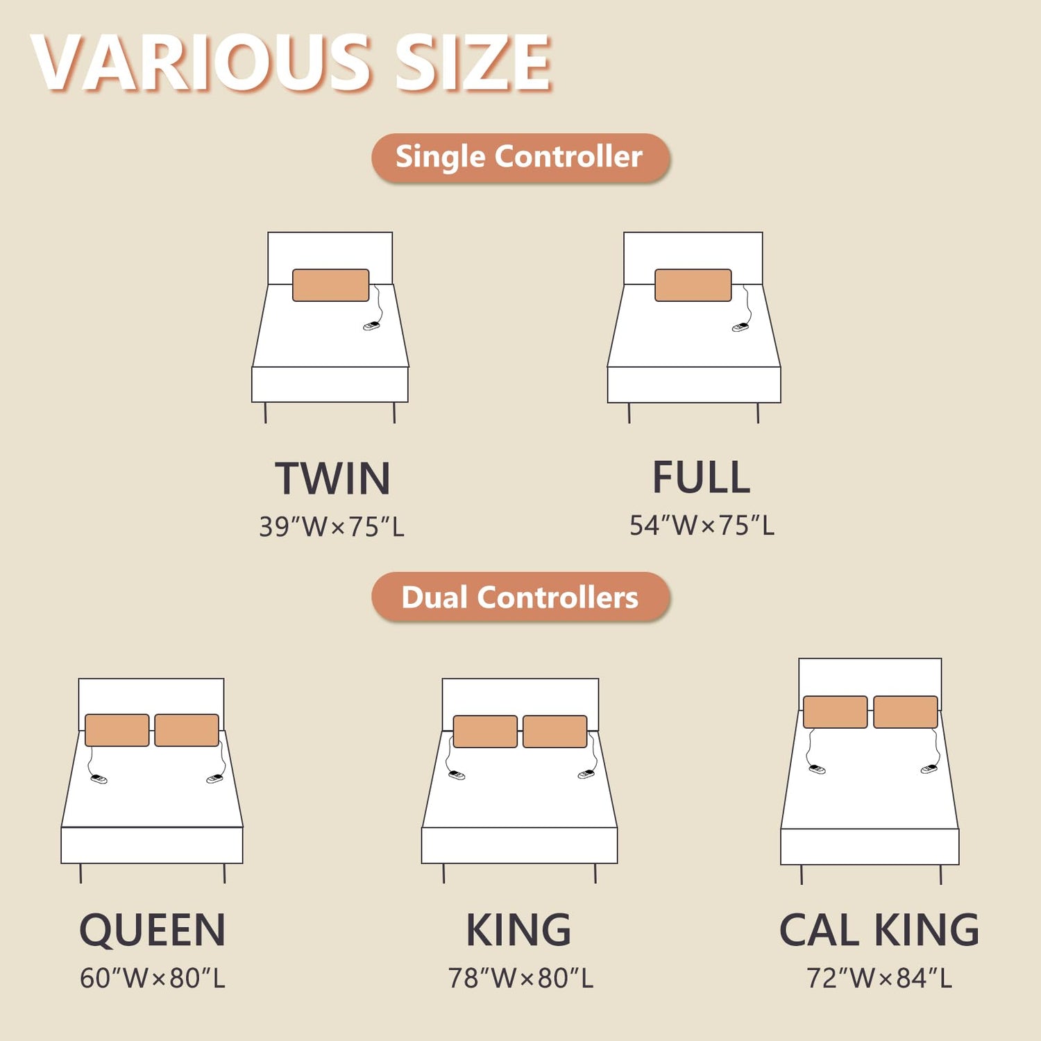 - Multiple Choice: There are five sizes to choose from heated mattress pad, each size corresponds to a different number of controllers. The Twin and Full size comes with single controller, the Queen, King and California king size comes with dual controllers.