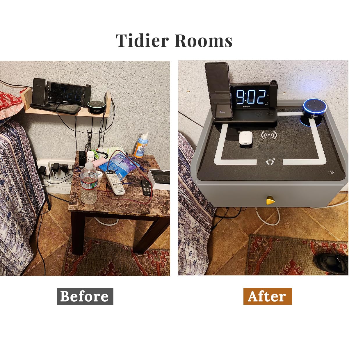- Wall Mounted Nightstand:Our latest smart furniture bedside table is equipped with an 18W wireless charging station that supports built-in wireless charging for cell phones.It also has USB*4,Type-C*2 to meet all your device charging needs,eliminating the hassle of messy charging cables.
