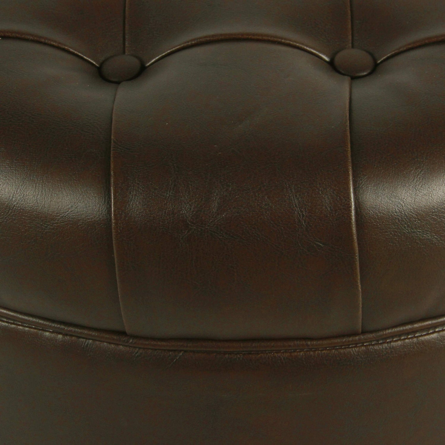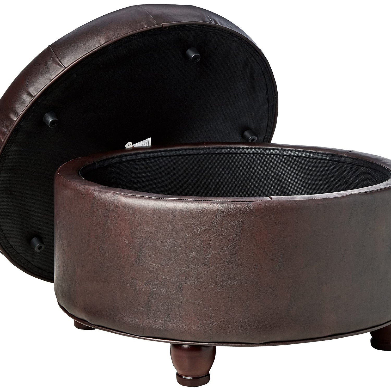 - STORAGE OTTOMAN: With it's rich Faux Leather our Round Ottoman with Storage can be used as a ottoman coffee table | Perfectly completed with tapered wood legs in a dark walnut finish along with button tufting on top