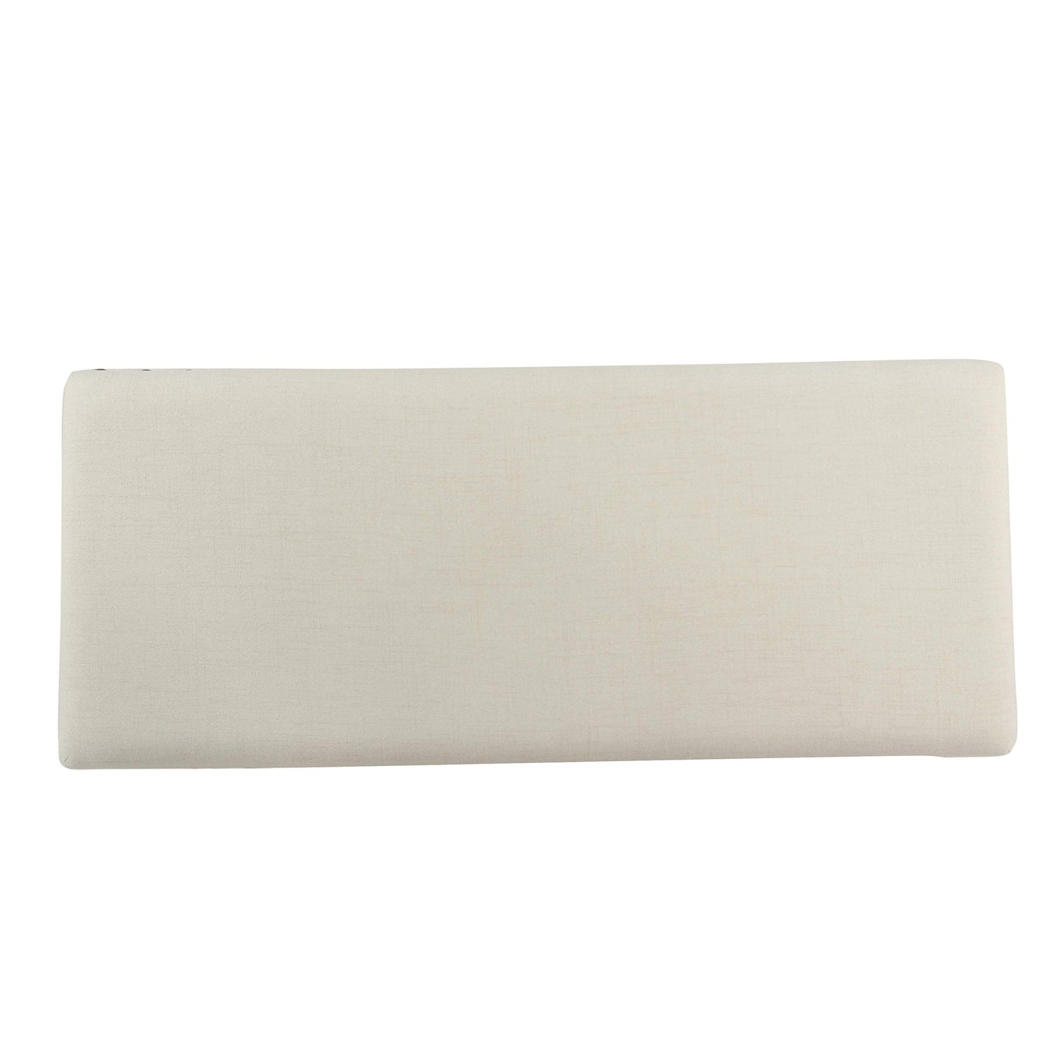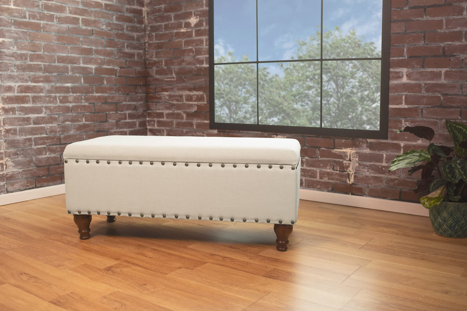 Details: Add style and storage to any room in your home with our classic long storage bench. Featuring timeless nailhead trim and warm walnut finished wood legs, our multifunctional storage bench can provide seating and double as a coffee table, serve as a bedroom bench or as an entryway bench with storage. The luxuriously soft linen-like cream fabric easily blends with many different styles and colors. If you’re looking for a premium addition to your home at a reasonable price, make this your next accent furniture investment. Easy to assemble and maintain. Also available in classic neutrals, grays and blues.Please note that fabric and wood colors may appear slightly different due to variations in lighting or screen settings
