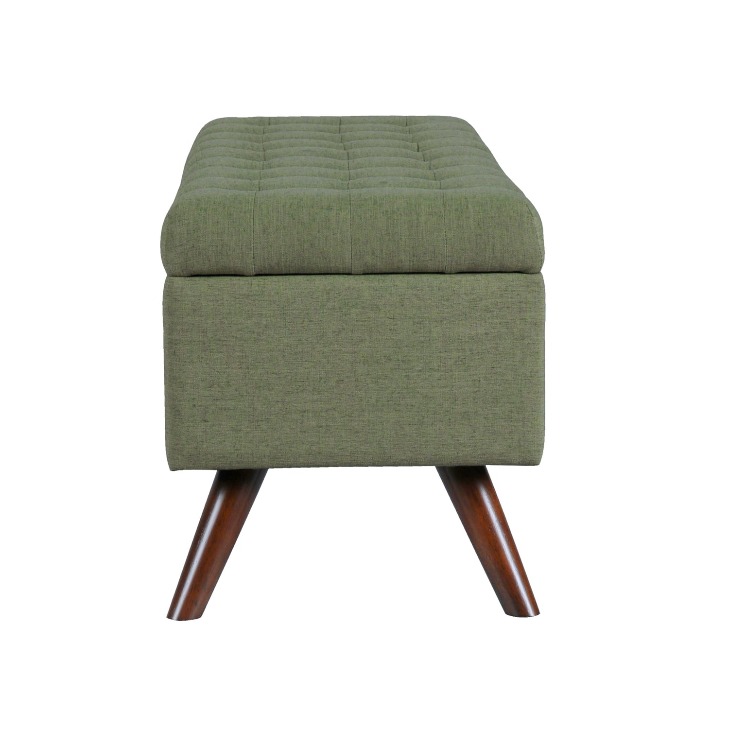 Details: The HomePop Modern Storage Bench features clean, modern lines and stylish wood legs. This storage bench can be used as a coffee table ottoman to serve guests, or as an end of bed bench to store blankets and pillows when not in use. This multifunctional bench can provide extra seating in your dining room or living room, or hide shoes and gloves in your entryway. With a hinged lid that features button tufting it provides functional style for any room. Easy to assemble and maintain.Please note that fabric and wood colors may appear slightly different due to variations in lighting or screen settings.
