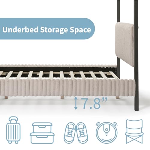 Embrace the perfect blend of style and functionality with the Evadne Modern Canopy Bed Frame, and transform your bedroom into a chic, cosy retreat. The spacious underbed design provides convenient storage options, making it easy to tuck away luggage and other items while simplifying your cleaning routine. Choose between two luxurious fabric options—boucle fabric or fur corduroy—and let your imagination run wild as you style your dream sleeping space.