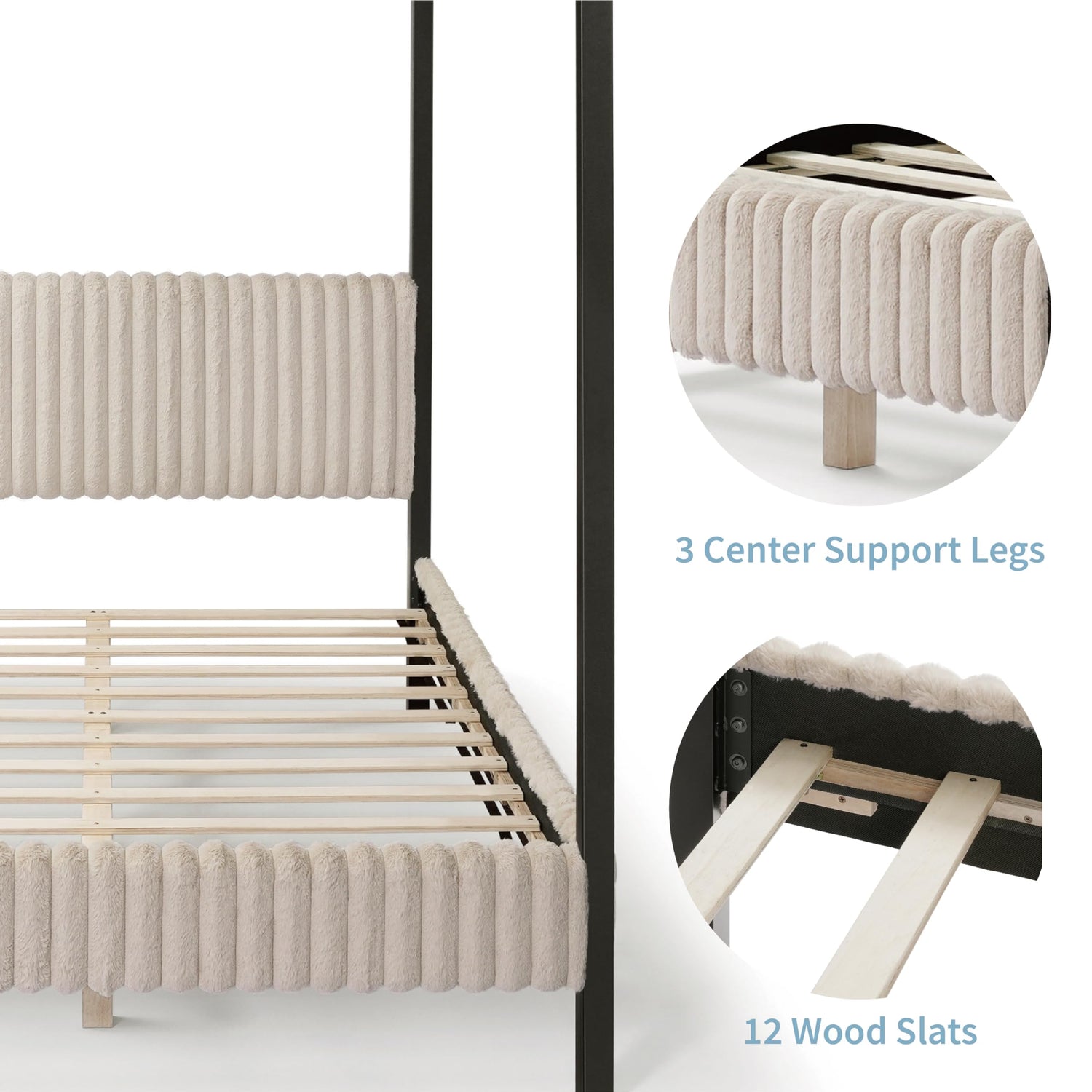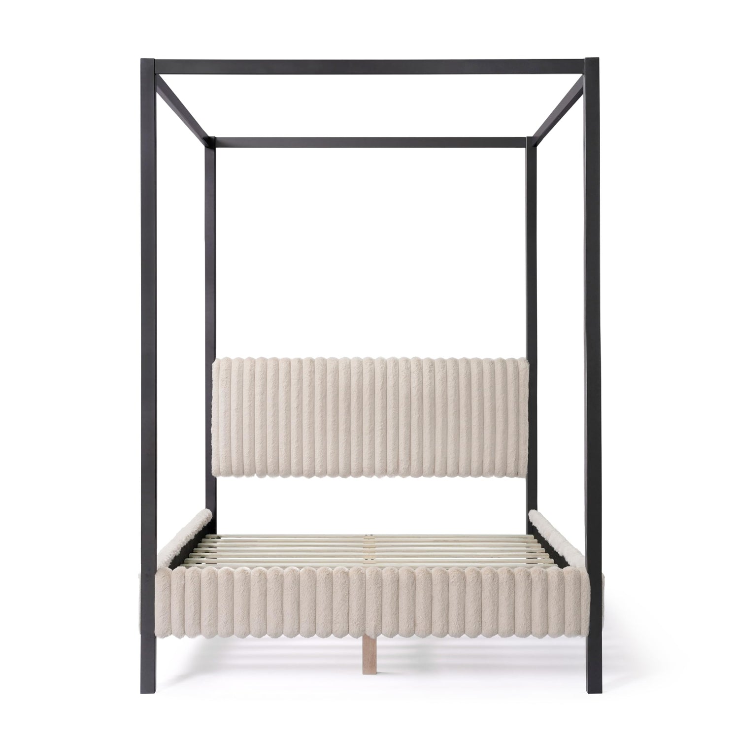 Evadne Modern Canopy Bed Frame Queen Size in Light Brown with Upholstered Channel Headboard and Wooden Slats Support