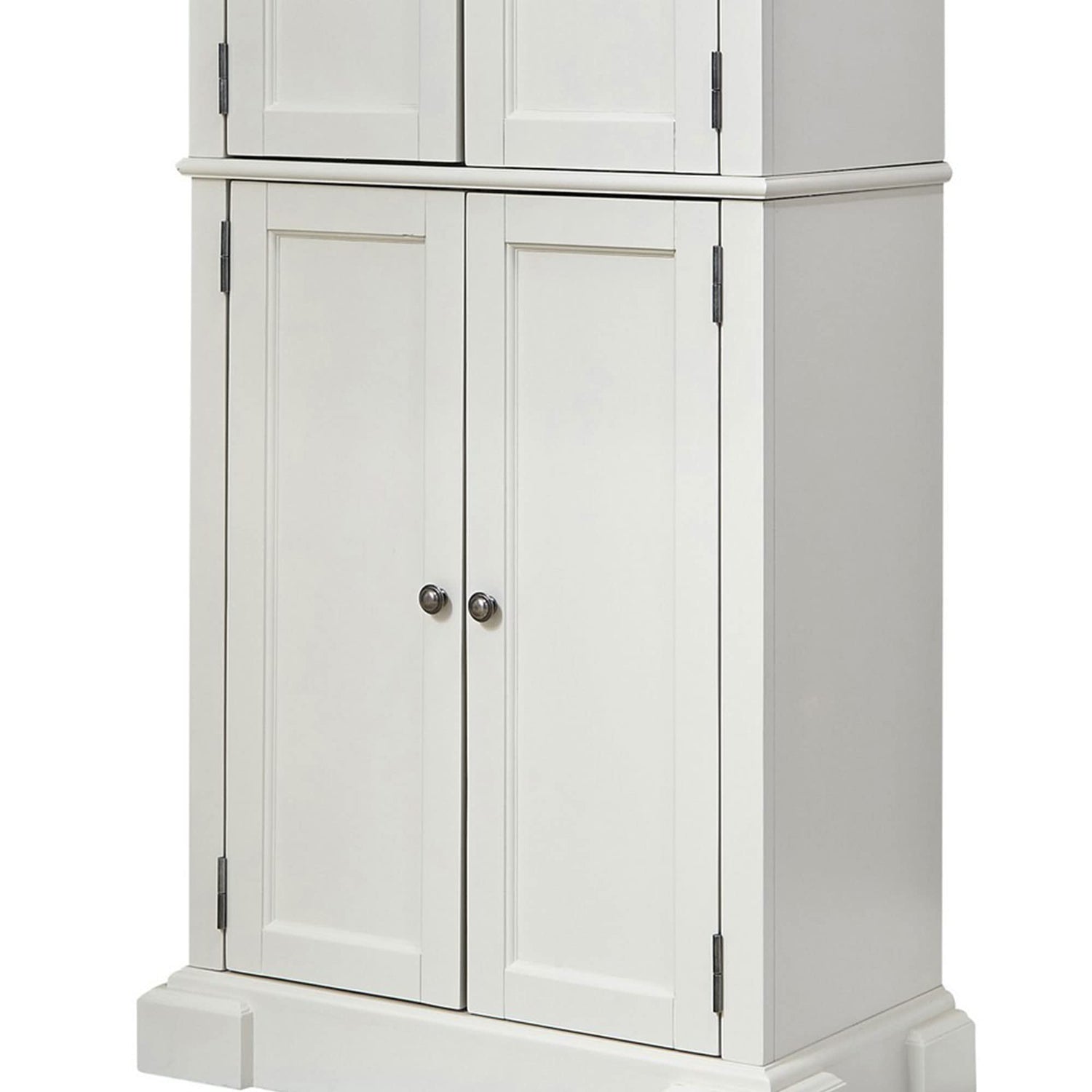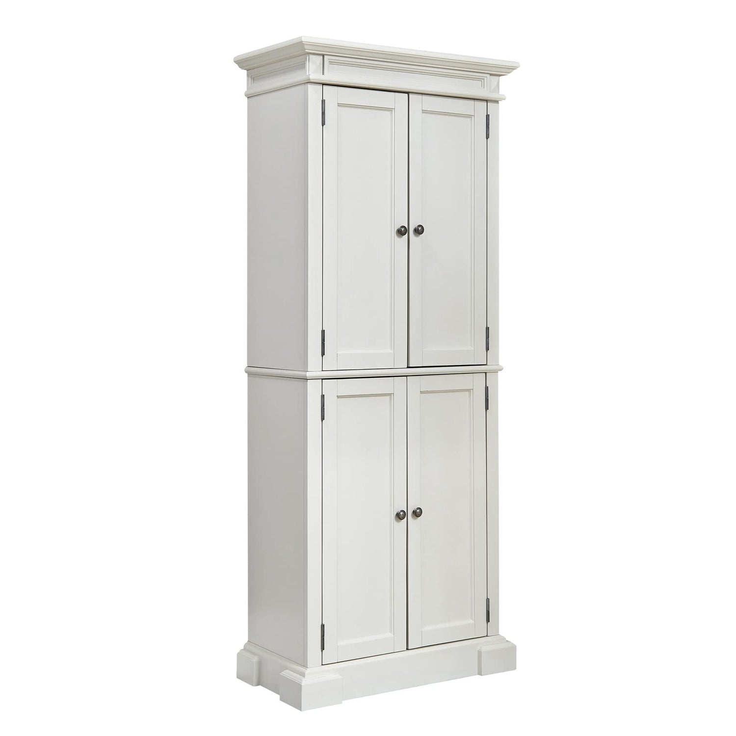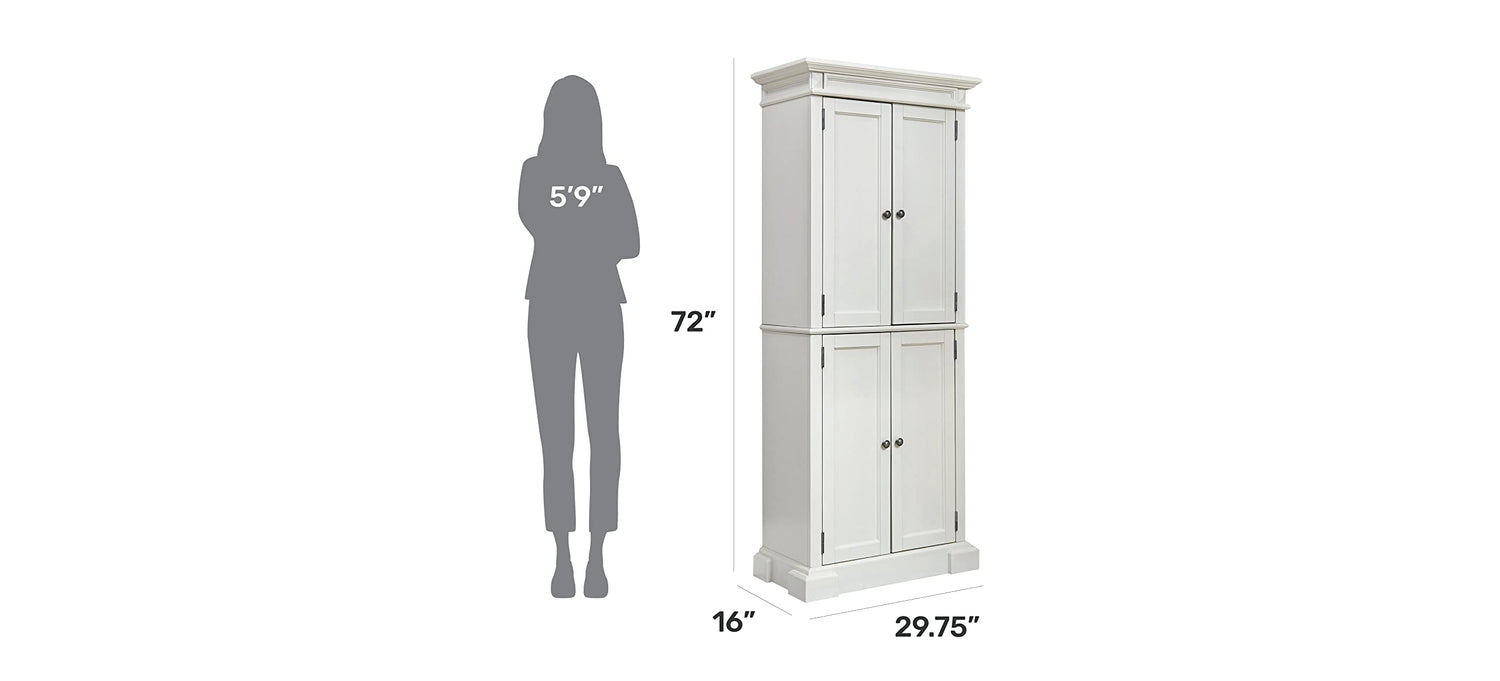 Details: The Americana pantry storage cabinet is made of hardwood solids and engineered wood. Comes with multi step white finish. Pastoral design elements are apparent in the strong lines of the recessed panel doors as well as in the prominent base and top moldings. Ample storage can be found in both storage cabinets, each with a fixed shelf and two adjustable shelves. Easy to assemble. Measures 30-inch width by 16-inch depth by 72-inch height.