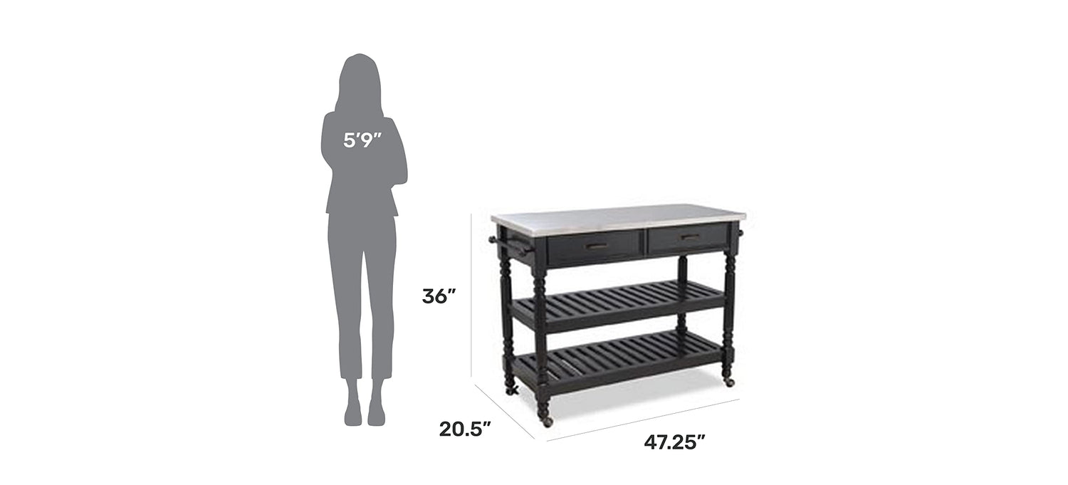 Details: Turn your kitchen into the most magnetic room of the house with this Homestyles General Line Kitchen Cart. Easily roll the prep space wherever it's needed, and bring extra storage and convenience with it. The black finish matches any surrounding décor and the drawers and shelves keeps the space tidy. With solid construction, a timeless stainless steel top, and a durable clear coat, it is easy to clean and maintain.