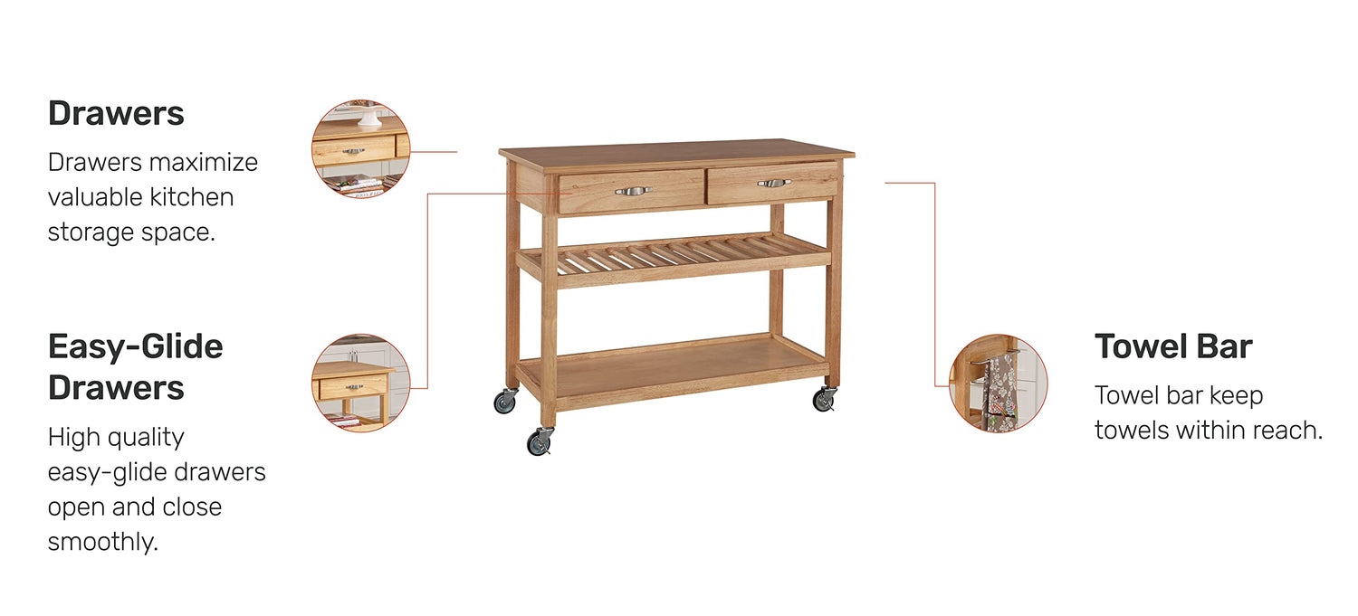 This solid wood top kitchen cart is perfect for the kitchen needing just a bit more surface and storage space. It features utility drawers and two open shelves and a towel bar. Heavy duty locking casters provide the added convenience of mobility. The natural finished cart is constructed from sustainable hardwood with a clear coat finish helping to protect against marring from normal use. Assembly required. Measures 44-inch width by 20-1/2-inch depth by 36-inch height.