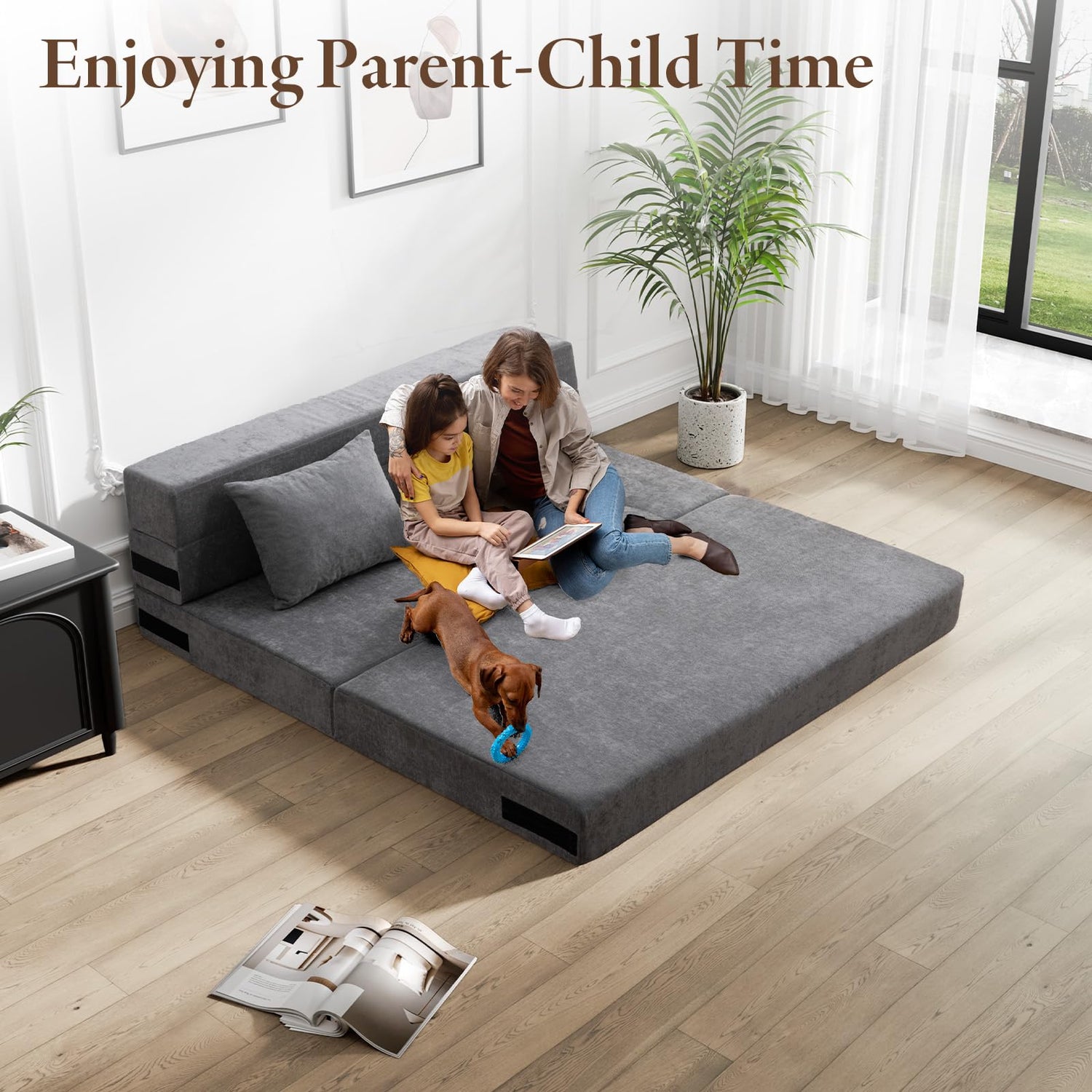 HOMFINE Folding Sofa Bed - Convertible Sleeper Chair with Pillow, Fold Out Couch, Memory Foam Floor Mattress, Futon Couch, Lazy Sofa for Living Room/Dorm/Guest Room/Home Office, Grey, Queen Size