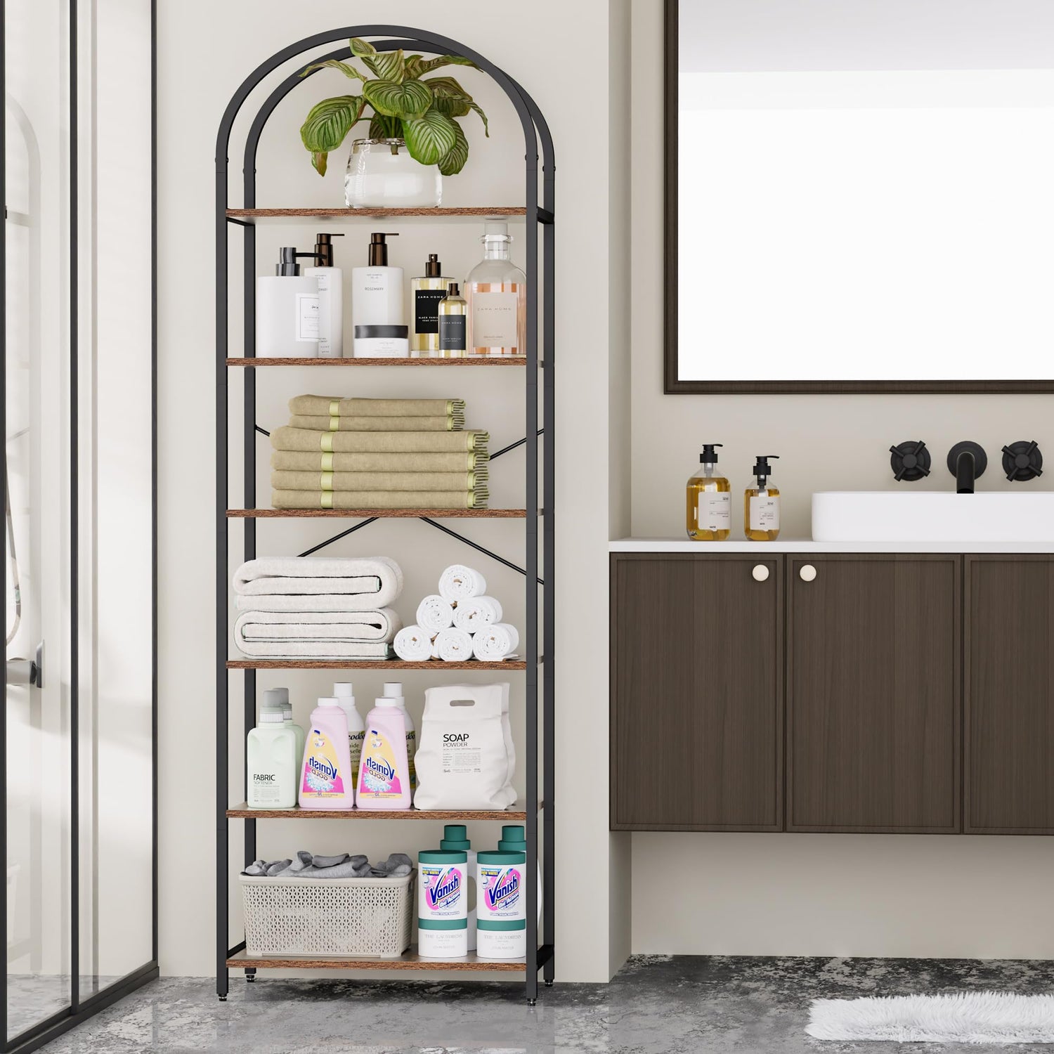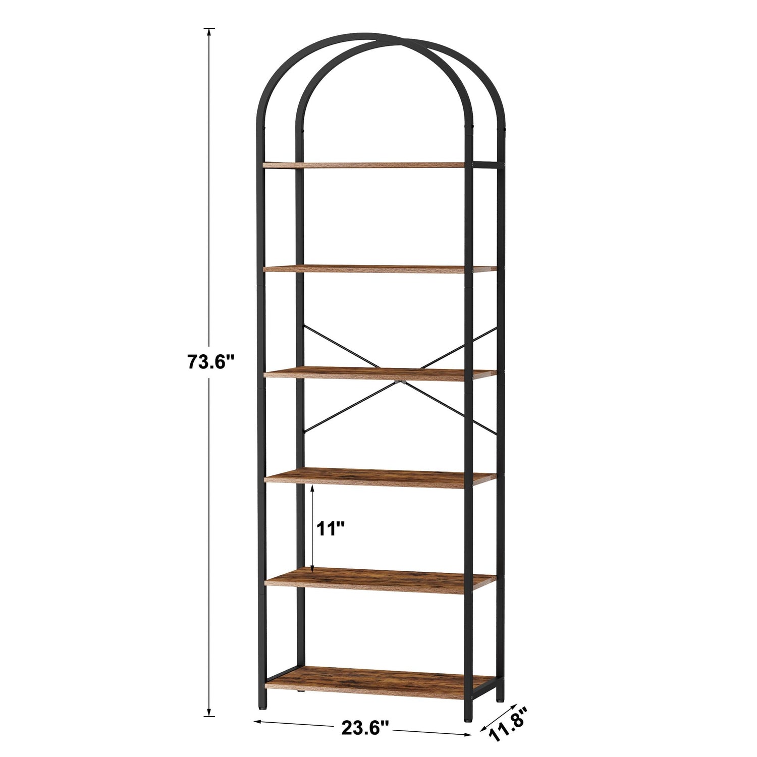 Homhedy 6-Tier Bookshelf Arched Display Racks, Wood and Metal Bookcase, Tall Bookshelf, Industrial Display Standing Shelf Unit, for Home Office, Living Room, Bedroom, Bathroom, Rustic Brown