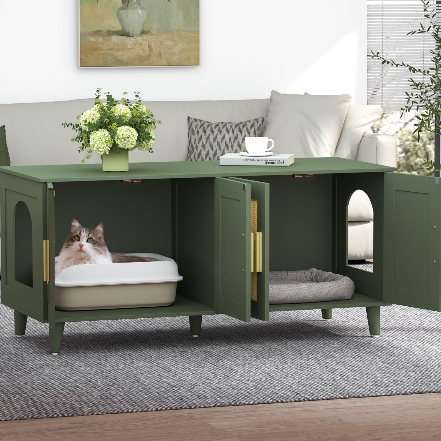 - Thoughtful design: Each side of our cat litter box furniture comes with a cat hole, allowing your cats to come in and out more freely,Double cabinet doors allow you to scoop the litter daily and store cat food more conveniently.water-resistant veneered surface make cleaning a breeze
