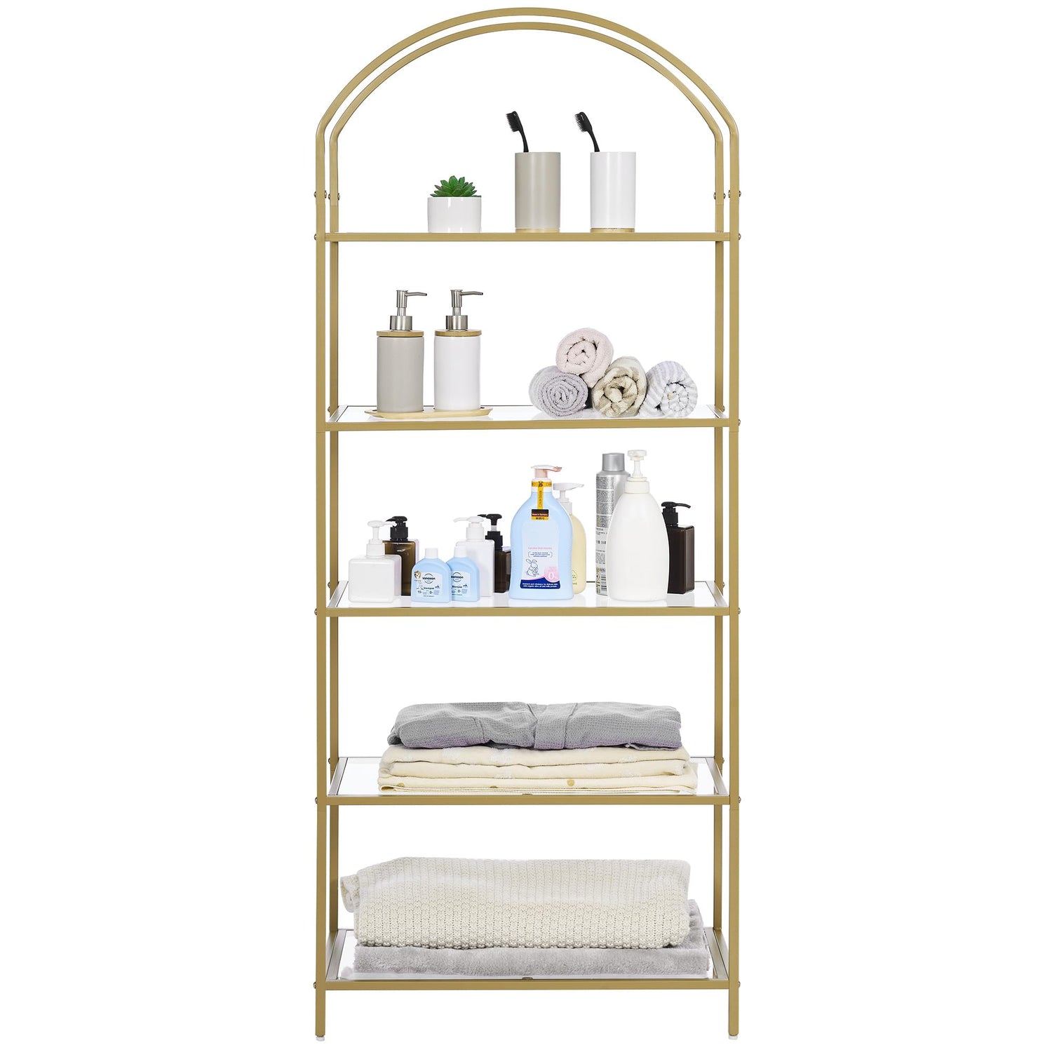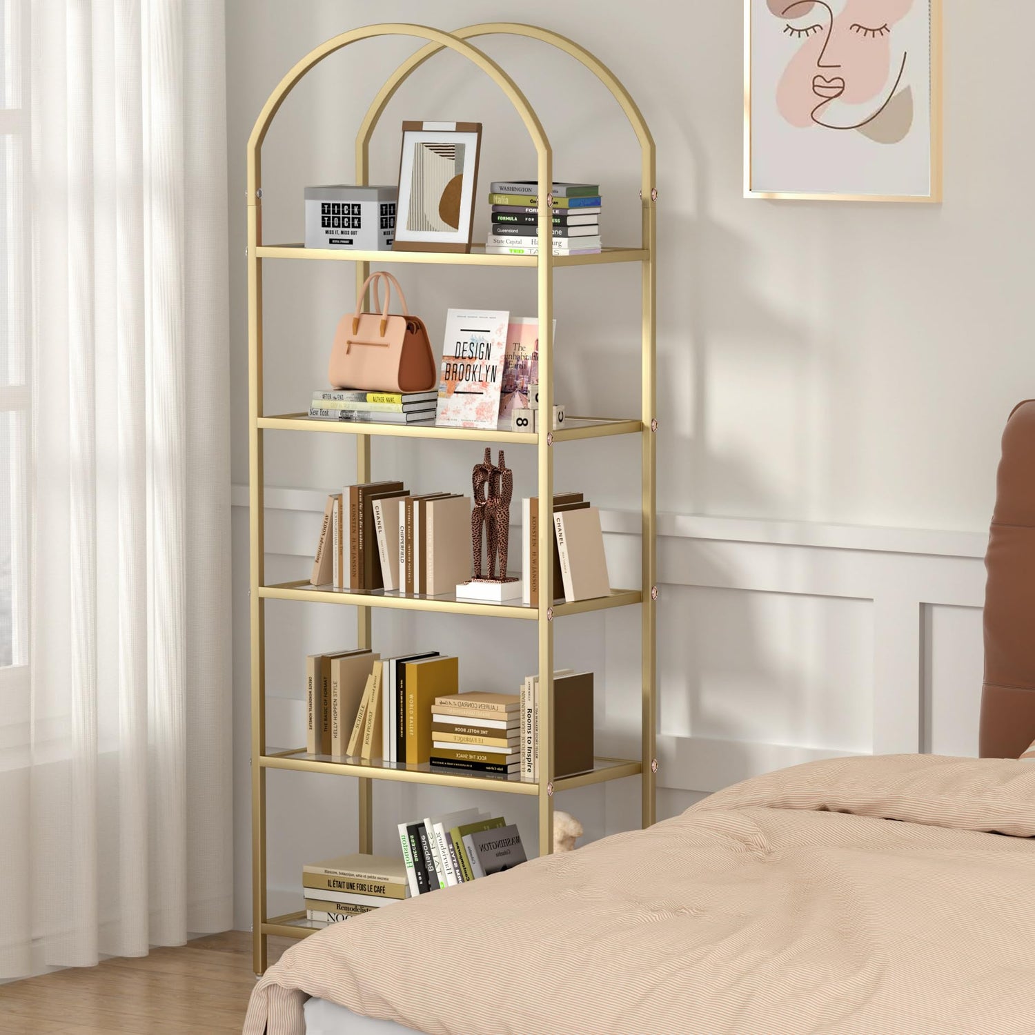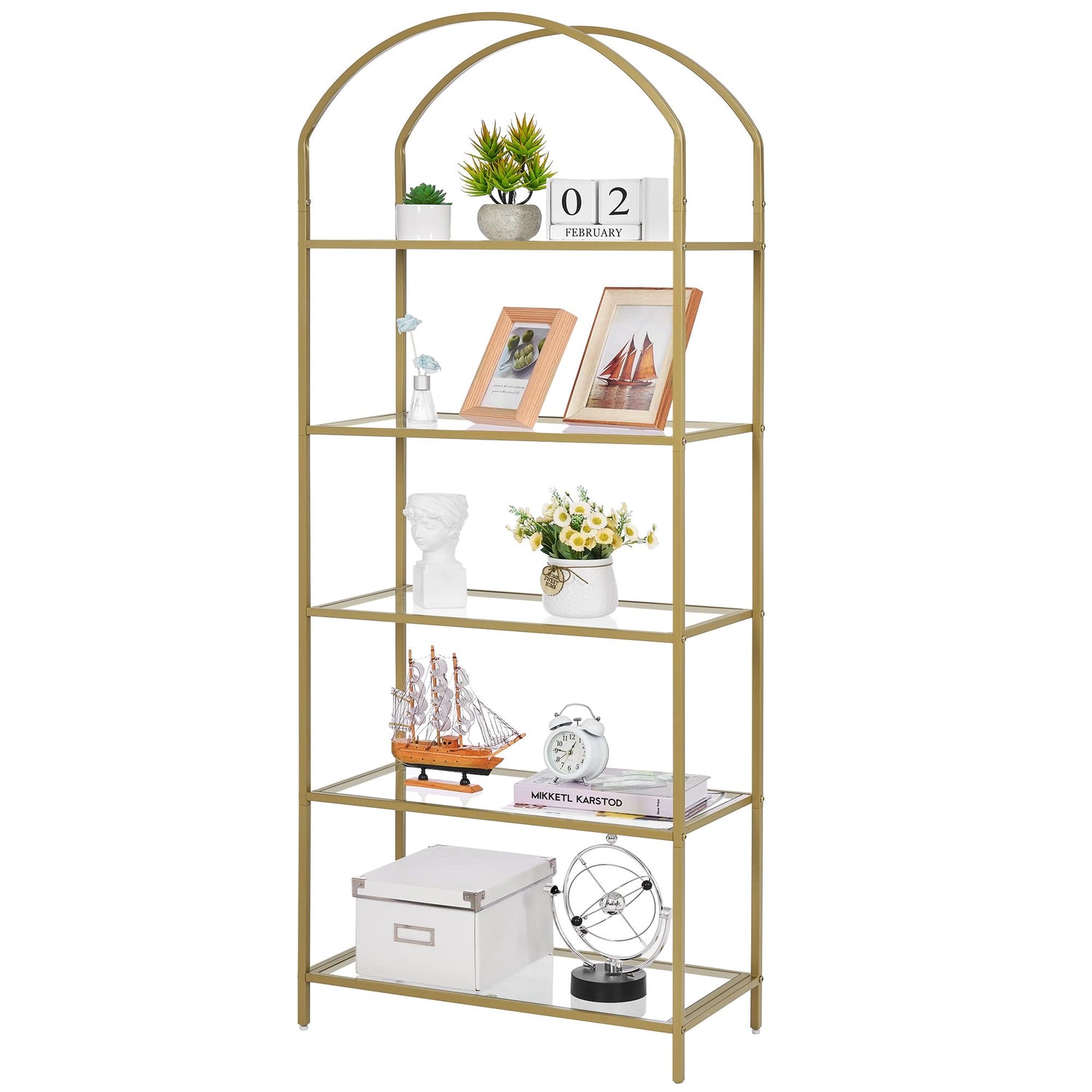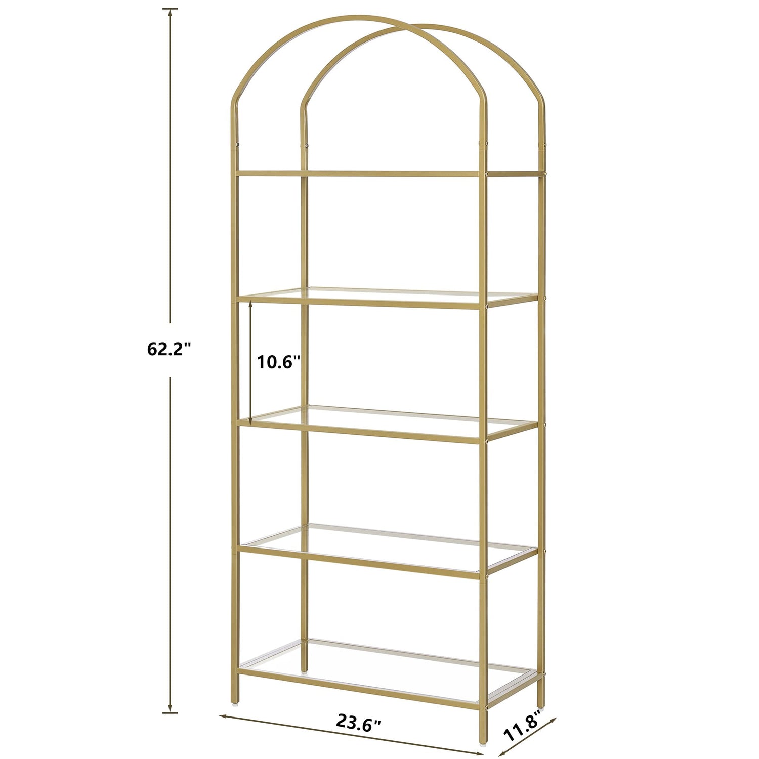 - Stylish and Functional: This 5-tier Steel Frame and glass Bookshelf with a gold finish is suitable for adding a touch of elegance to your home decor, while also providing ample storage and display space for your books, photos, plants, and other items.The arched design makes it a beautiful addition to any room