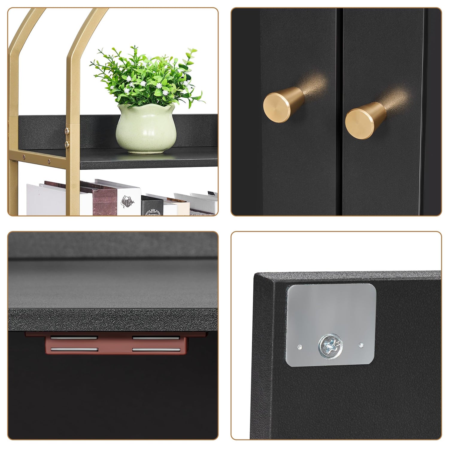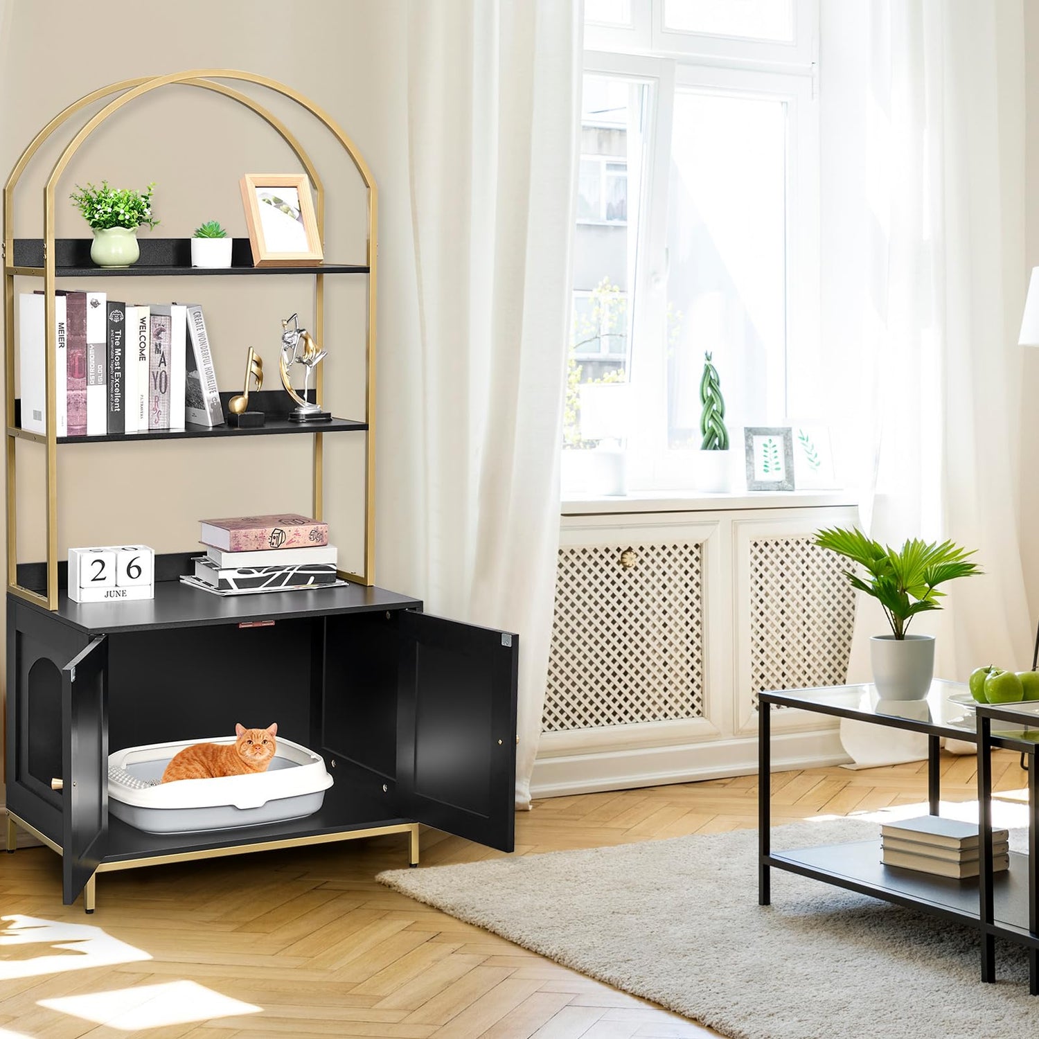 - Modern style: The cat litter box cabinet features black finish and metallic gold-colored metal frame, adding an elegant and stylish touch to your home decor. Its minimalist design and exquisite detailing inject a touch of luxury and sophistication into your living space