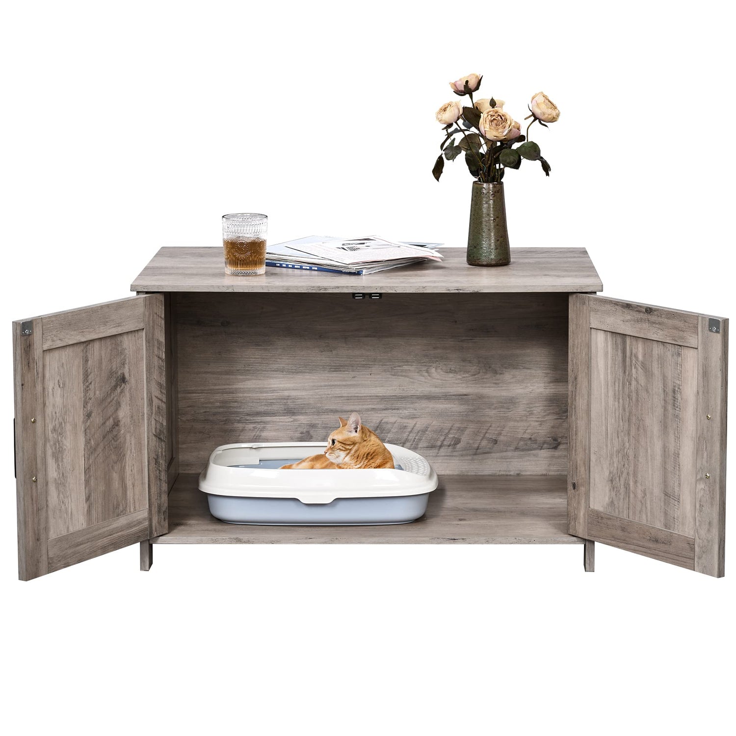 - More Considerate Details: You can install the entrance of the cat on the left or right for the convenience of you and your cat.Double cabinet doors allow you to scoop the litter daily and store cat food more conveniently.water-resistant veneered surface make cleaning a breeze.