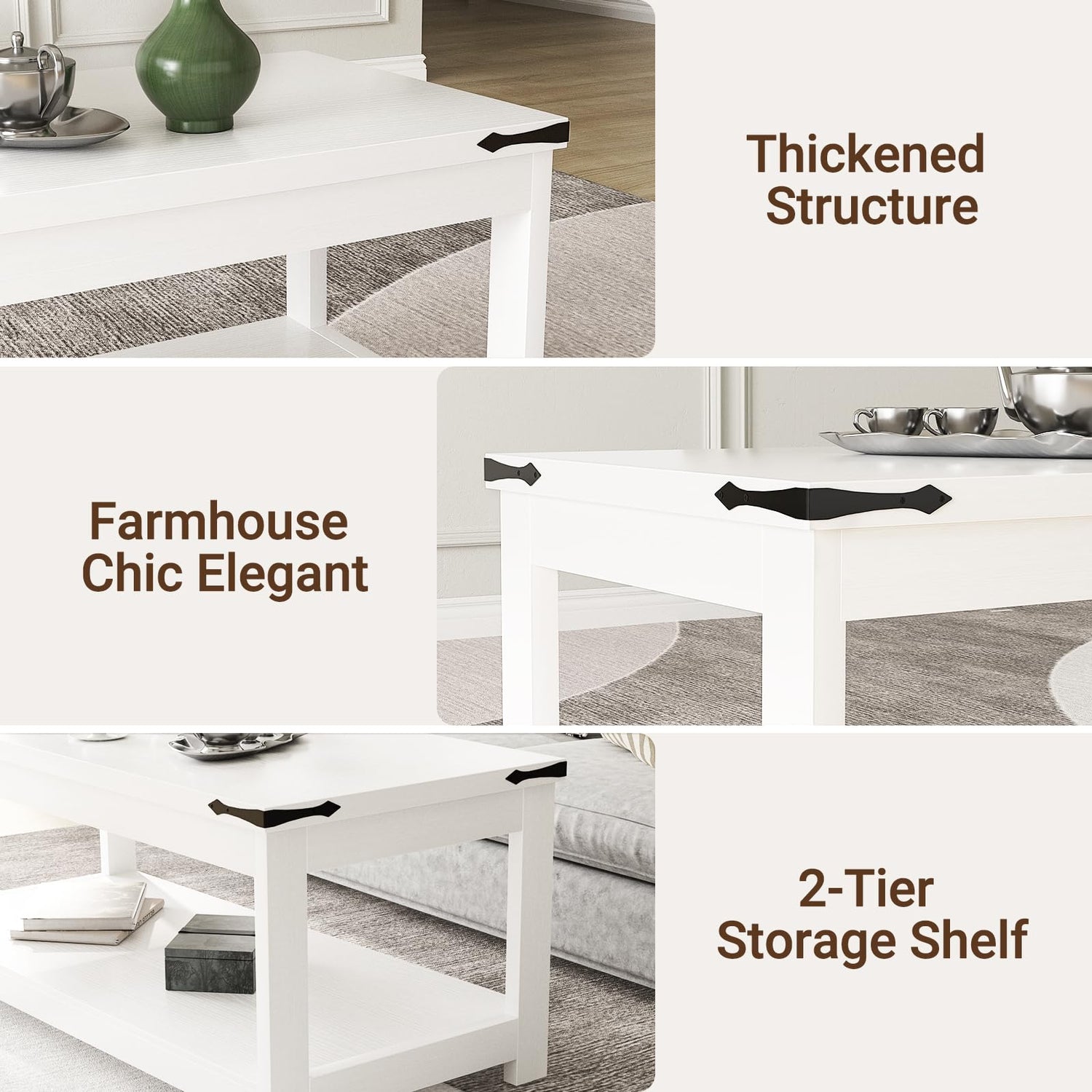 Homieasy Coffee Table with Storage Shelf, 43.3” Farmhouse Wood Coffee Tables for Living Room, Modern Center Tea Table, White