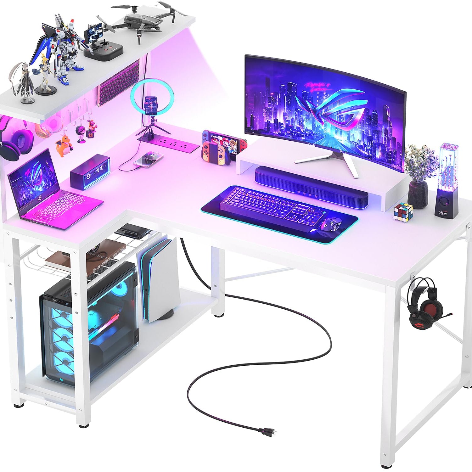 Details: Homieasy Small Gaming Desk with Power Outlets Pegboard LED Light, 43 Inch L Shaped Computer Desk with Monitor Stand Storage Shelves, Reversible Corner Desk with Headset Hooks, White