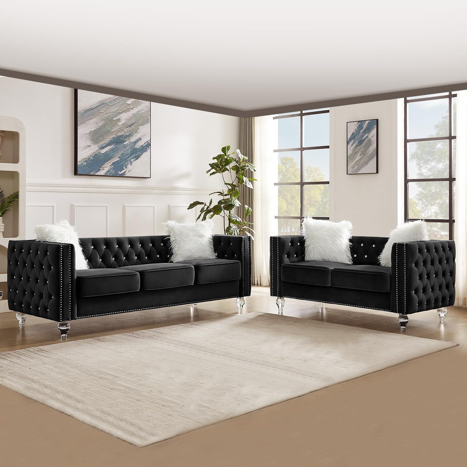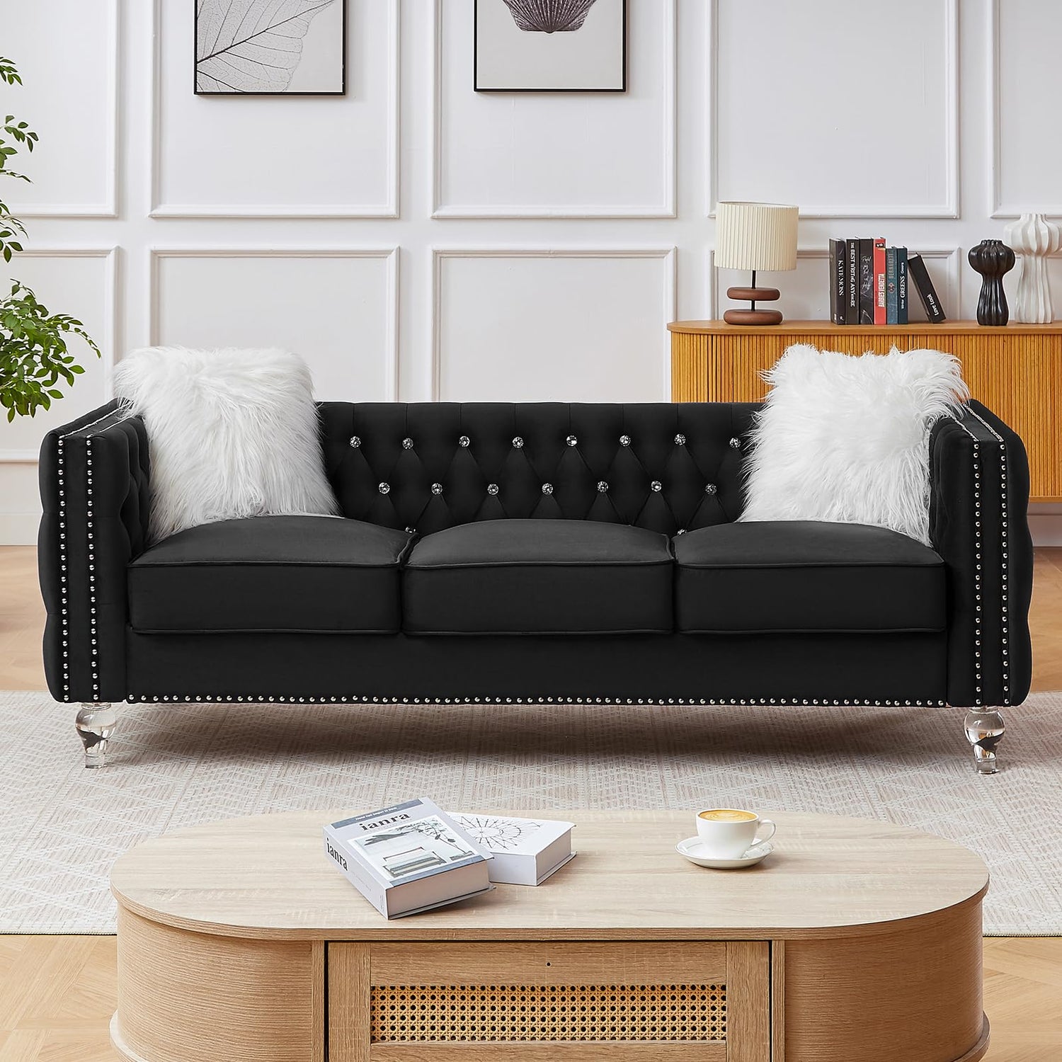 Homies Life 83" Chesterfield Sofa, Velvet Mid-Century Modern Upholstered Couch with 2 Throw Pillows and Acrylic Legs, Nailhead Button Tufted Vintage Sofa for Living Room, Apartment, Office, Black