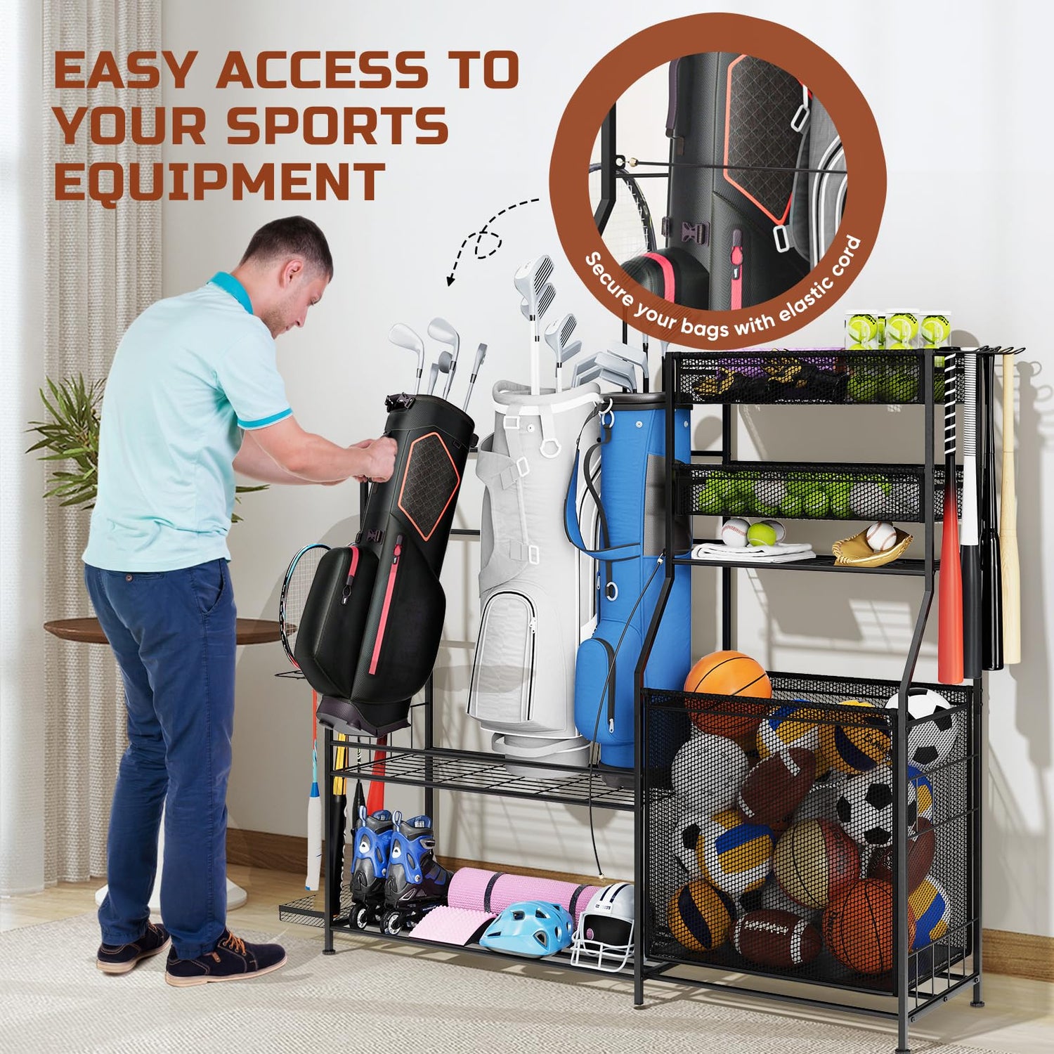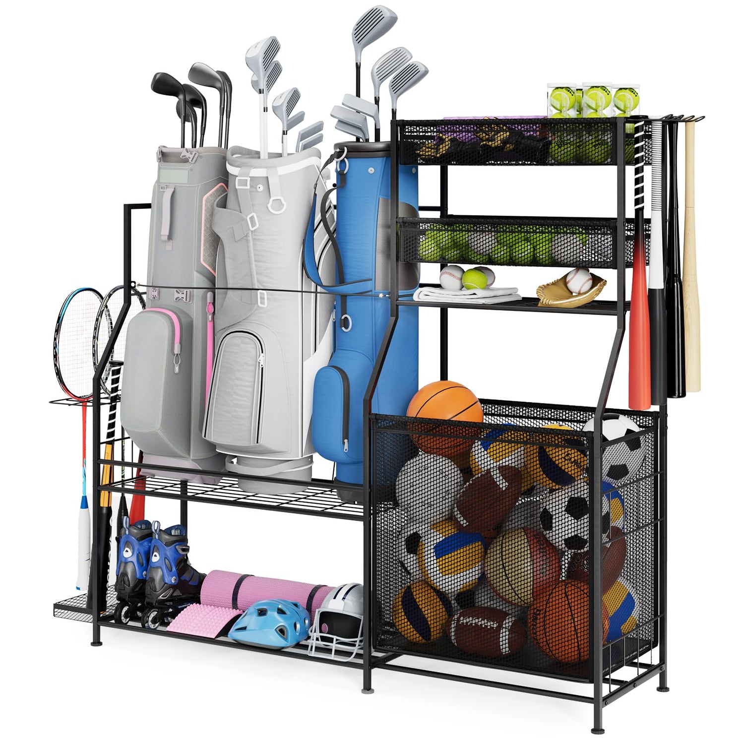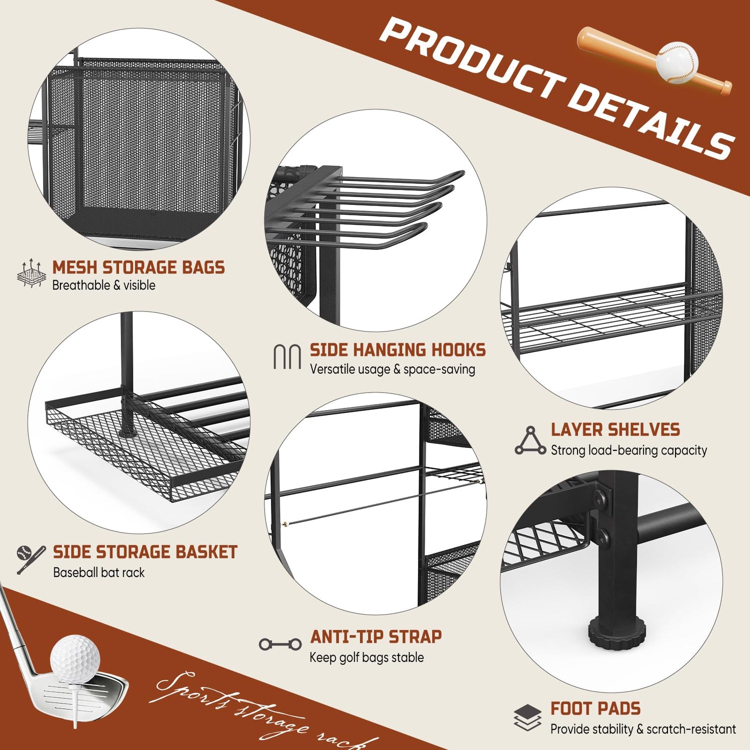 - End Garage Clutter with Smart Storage Solutions. Say goodbye to messy garages! The sports ball storage rack features a golf bag stand, 5 spacious shelves, a side yoga mat holder, a bat holder, and multiple storage hooks. Everything has its place, making it easy to find and store your equipment.