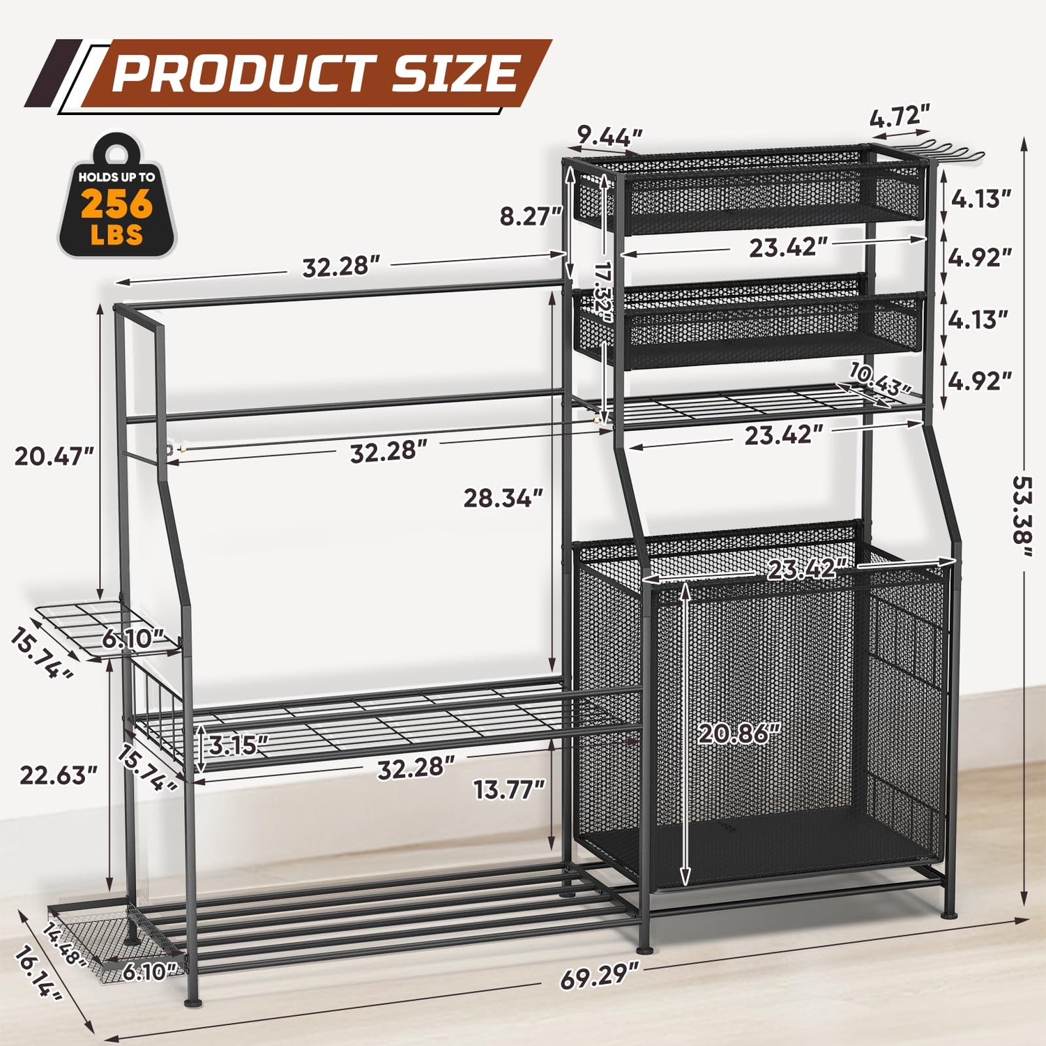- Spacious & Practical Design. With overall dimensions of 64.56" L x 16.14" W x 53.38" H, our sports organizer fits perfectly in your garage or storage room. The golf bag stand measures 32.28" L x 14.57" W, accommodating up to 3 standard golf bags with ease.