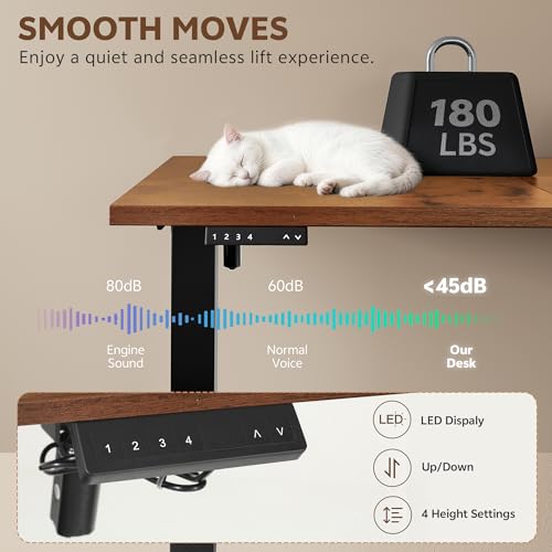 - [Sturdy & Stable] This standing desk with storage features a powerful lifting system for smooth, stable operation. It supports up to 220 lbs, operates at a steady speed of 25 mm/s, and runs quietly. The lifting system features an LED display control panel with 4 preset heights for quick desktop adjustment.