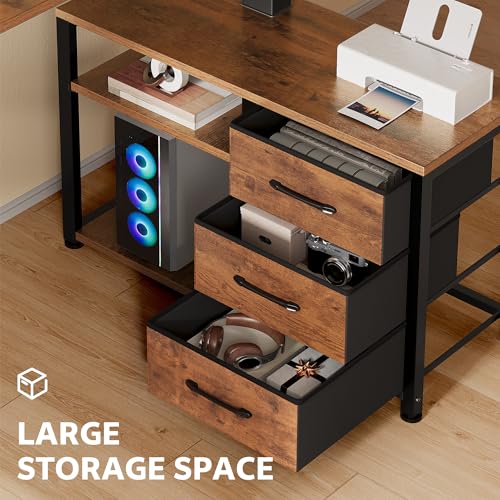 - [Large Storage Space] L shaped electric standing desk features 3 spacious fabric drawers and 2 open shelves, meeting your diverse storage needs. Drawers store documents, books, and office supplies, while the movable open shelves fit a PC tower, decor, etc.