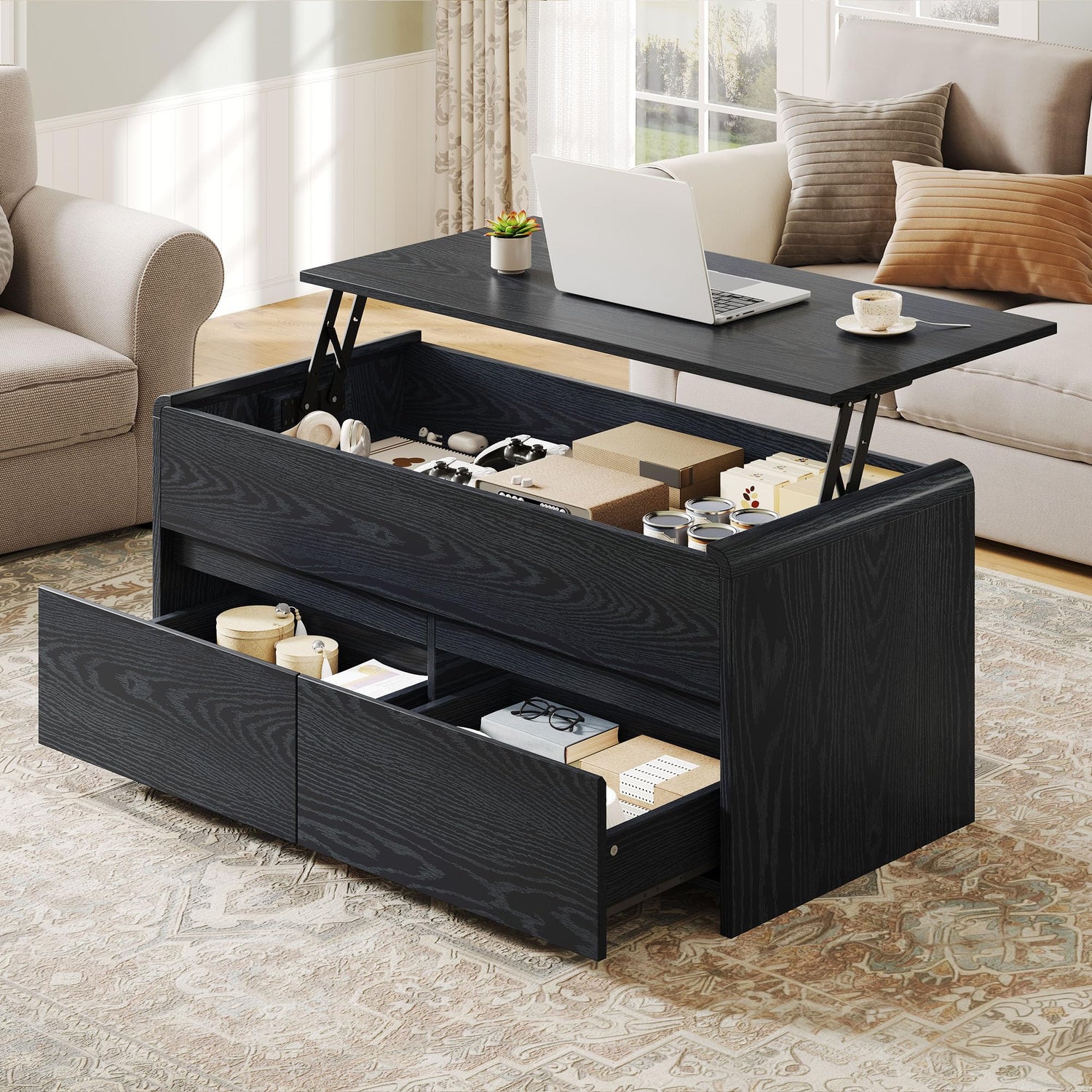 - Lift Top Coffee Table: Our unique lift top coffee table can meet most of your usage needs. When it extended, it transforms into a home office desk. And when it closed, it functions as a coffee table or center table, complete with hidden compartments & open shelf for storing miscellaneous items