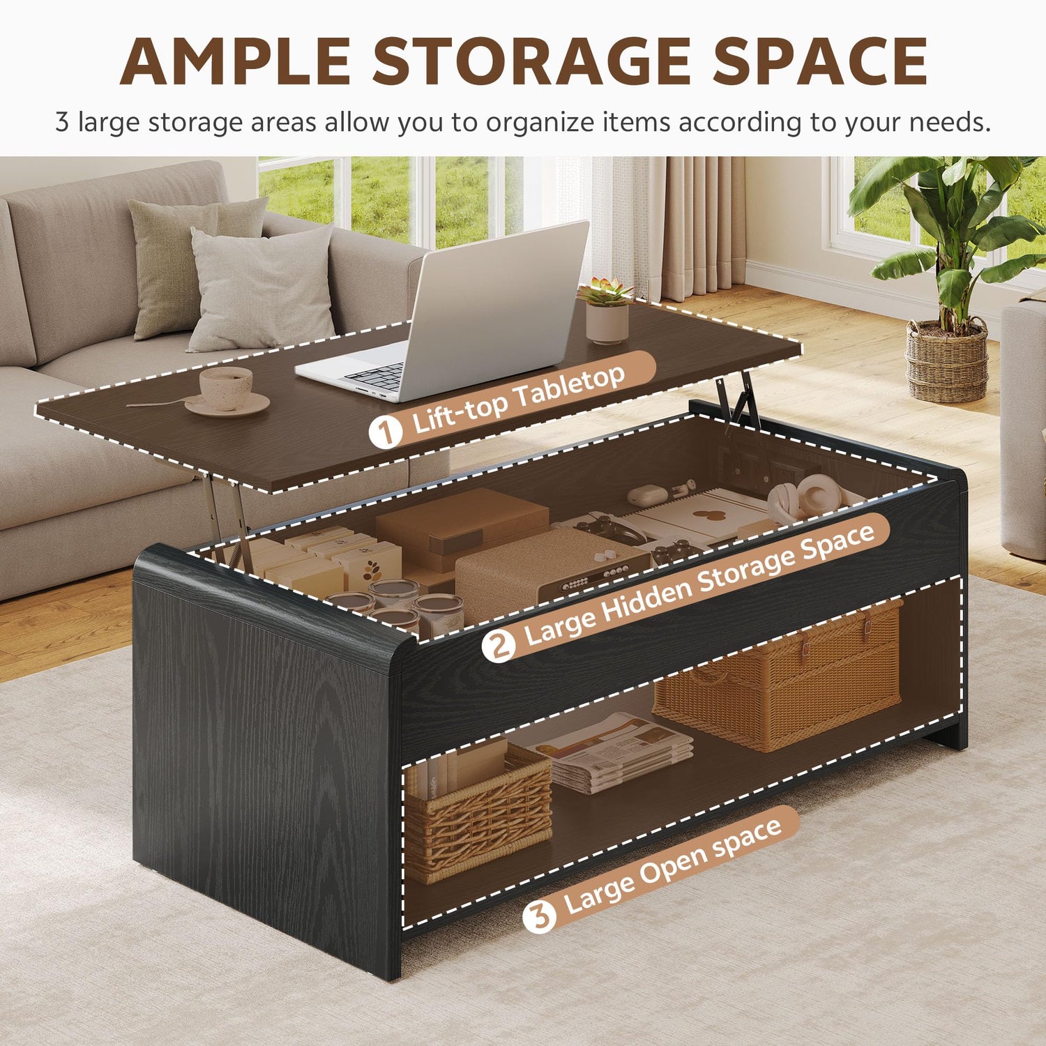 - Lift Top Coffee Table: Our unique lift top coffee table can meet most of your usage needs. When it extended, it transforms into a home office desk. And when it closed, it functions as a coffee table or center table, complete with hidden compartments & open shelf for storing miscellaneous items