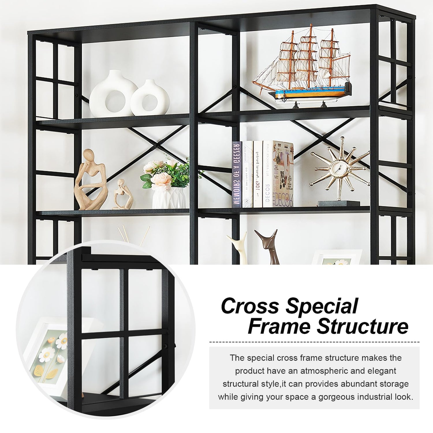 Introducing the HOMISSUE 84" Double Wide Industrial 7-Tier Black Bookshelf, where minimalist design meets functional elegance. This striking tall bookcase showcases a contemporary aesthetic, enhanced by its unique frame structure on both sides. The result is an atmospheric and simple appearance that effortlessly complements a variety of home decor styles.