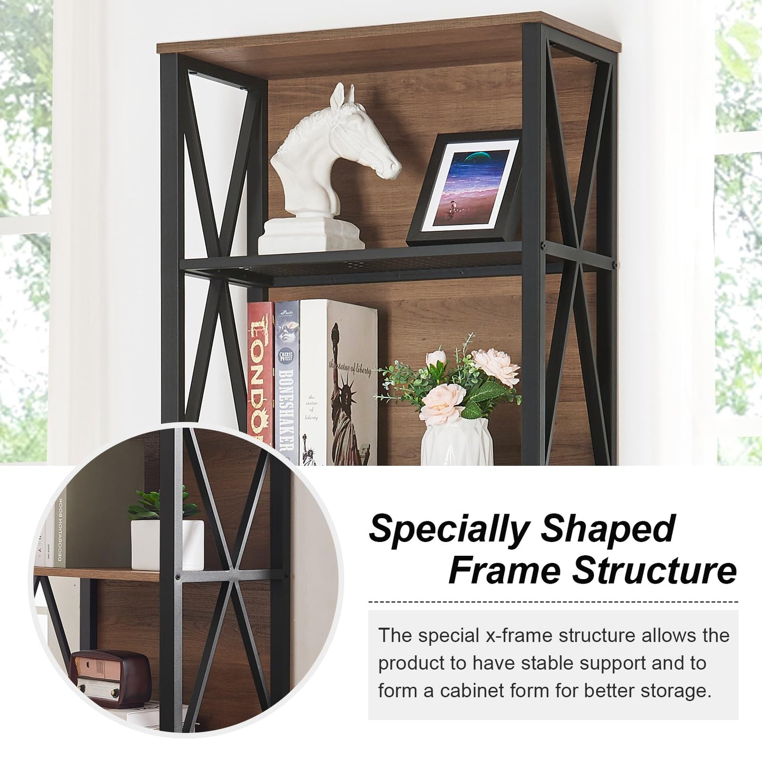 Designed with a unique back panel, this tall bookcase stands out from standard open bookshelves. Its design enables placement away from walls, allowing for a more integrated look while safely holding your favourite items without the risk of falling through. The vintage brown finish adds character and warmth, making it a perfect fit for various interior styles.