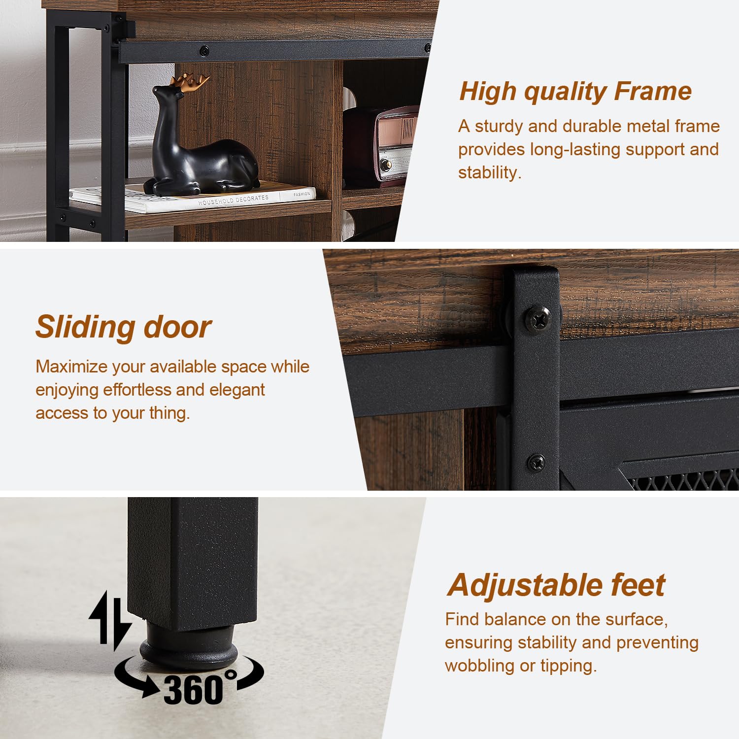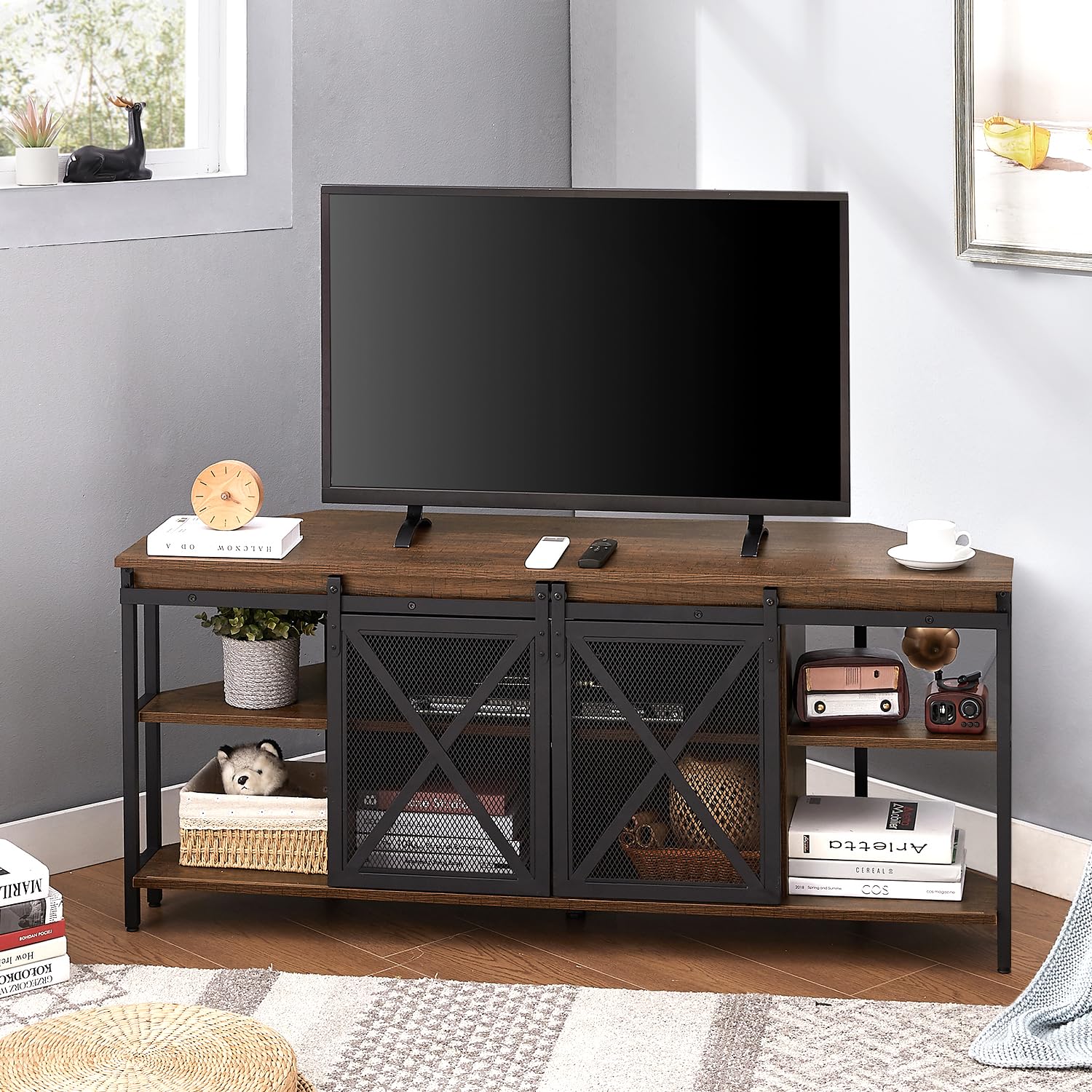 - Rustic Industrial Design: HOMISSUE Corner TV stand is crafted from high quality MDF with a distinctive finish; sliding barn doors not only make access to items easy, but also embody rustic charm.