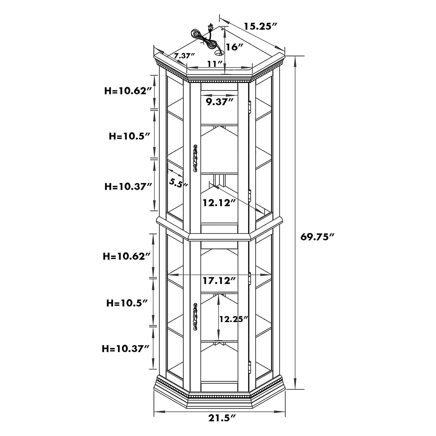 ADJUSTABLE SHELVES: This lighted corner curio cabinet offers 2 fixed shelves and 4 tempered glass shelves, perfect for valuable or fragile items. OVERALL DIMENSIONS: 69.75“ H x 21.5” W x 16” D, holds up to 150 lbs. Each shelf can hold up to 25 lbs. of dispersed weight.