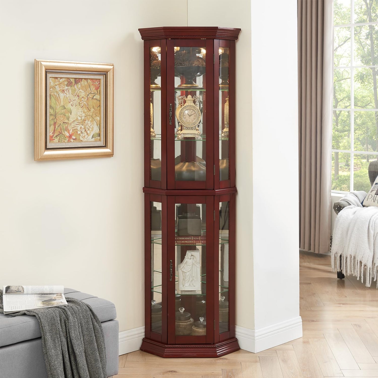 - 【Naturally Elegant Design】This Corner Curio Cabinet with Lights is available in a variety of finishes such as cherry, walnut, and oak, featuring smooth glass doors and a delicate curved silhouette. Its captivating design adds soothing charm to your décor and better showcases your personal collection.