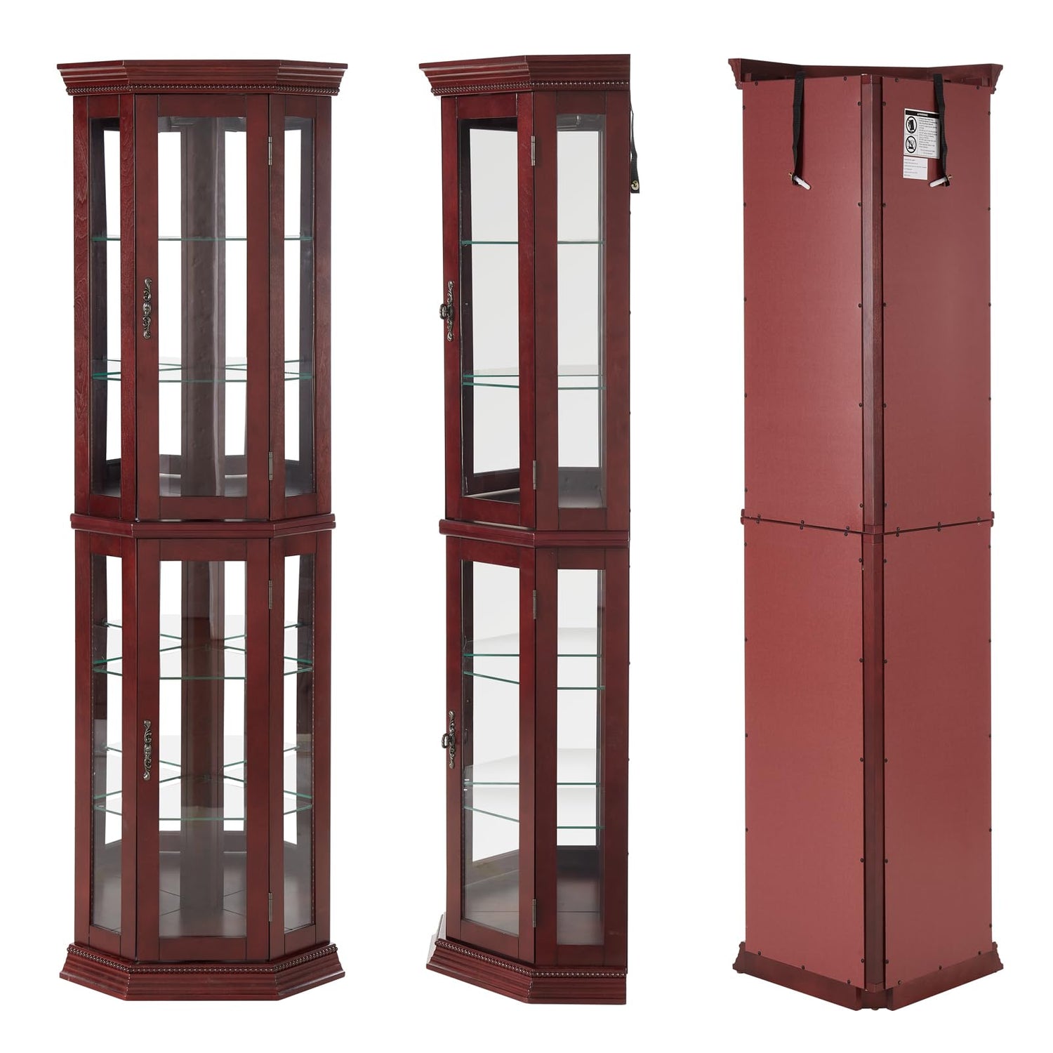 QUALITY MATERIALS: The Curio Cabinet with Glass Doors and Glass Shelves is constructed of quality engineered wood in a natural cherry/walnut/oak finish that showcases the unique grain color variations of the wood. Classic carved beadwork and decorative brass knobs create the stark contrast we love. Wood-framed tempered glass doors provide a safe and dust-free interior, and anti-tip straps ensure cabinet stability.